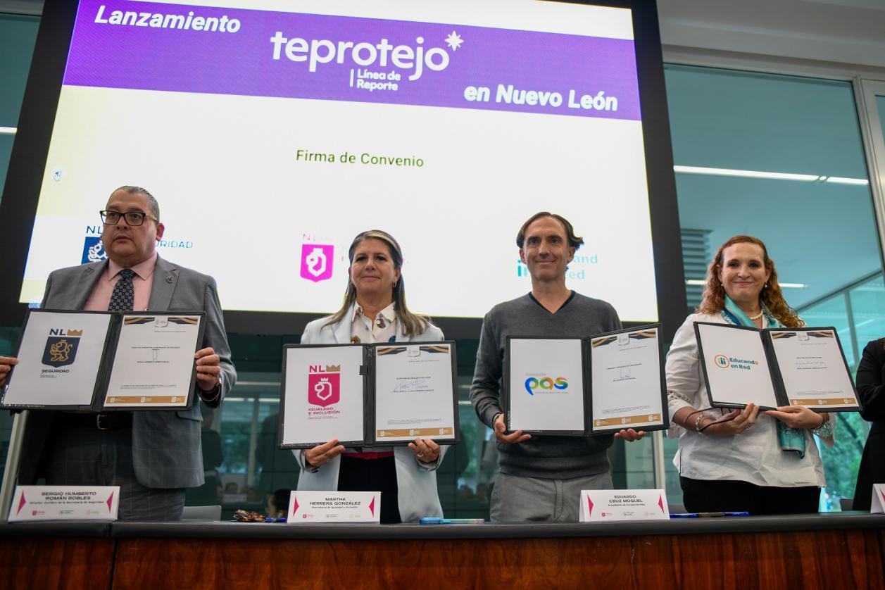 Monterrey, Nuevo León.- Con la firma del convenio de colaboración entre las Secretarías de Igualdad e Inclusión y Seguridad con la plataforma Te Protejo México, hoy Nuevo León se convirtió en el primer estado del País que contará con acceso a una línea virtual gratuita para proteger a las niñas, niños y adolescentes de casos de violencia digital.