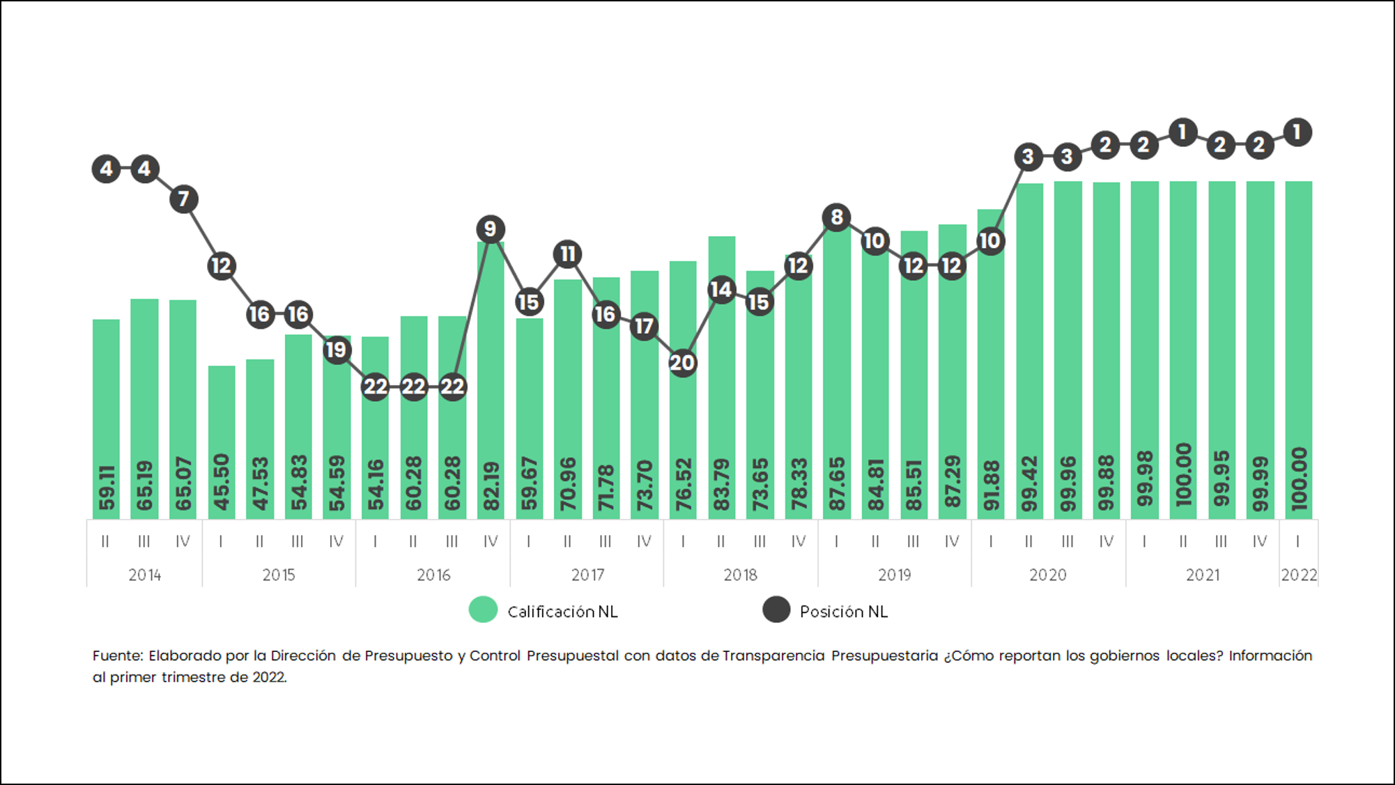 Nuevo León consiguió el primer lugar nacional en la clasificación del Índice de Calidad en la Información (ICI) reportada sobre Recursos Federales Transferidos, en la evaluación correspondiente al primer trimestre de 2022, realizada por la Secretaría de Hacienda y Crédito Público (SHCP). El estado consiguió la máxima calificación de 100 puntos, en tanto el promedio nacional es de 86.68 puntos.