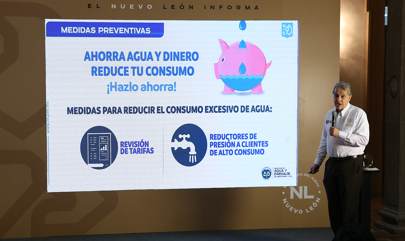 Tras reconocer que todavía falta el bajar aún más el consumo entre la población, Juan Ignacio Barragán Villarreal, Director de Servicios de Agua y Drenaje de Monterrey dijo que el Consejo de AyD aprobó estas medidas urgentes, entre las que se encuentran la tarifa de saneamiento que aunque existe en la Ley no se aplicaba en la entidad, además de la colocación de reductores de presión a usuarios de alto consumo.