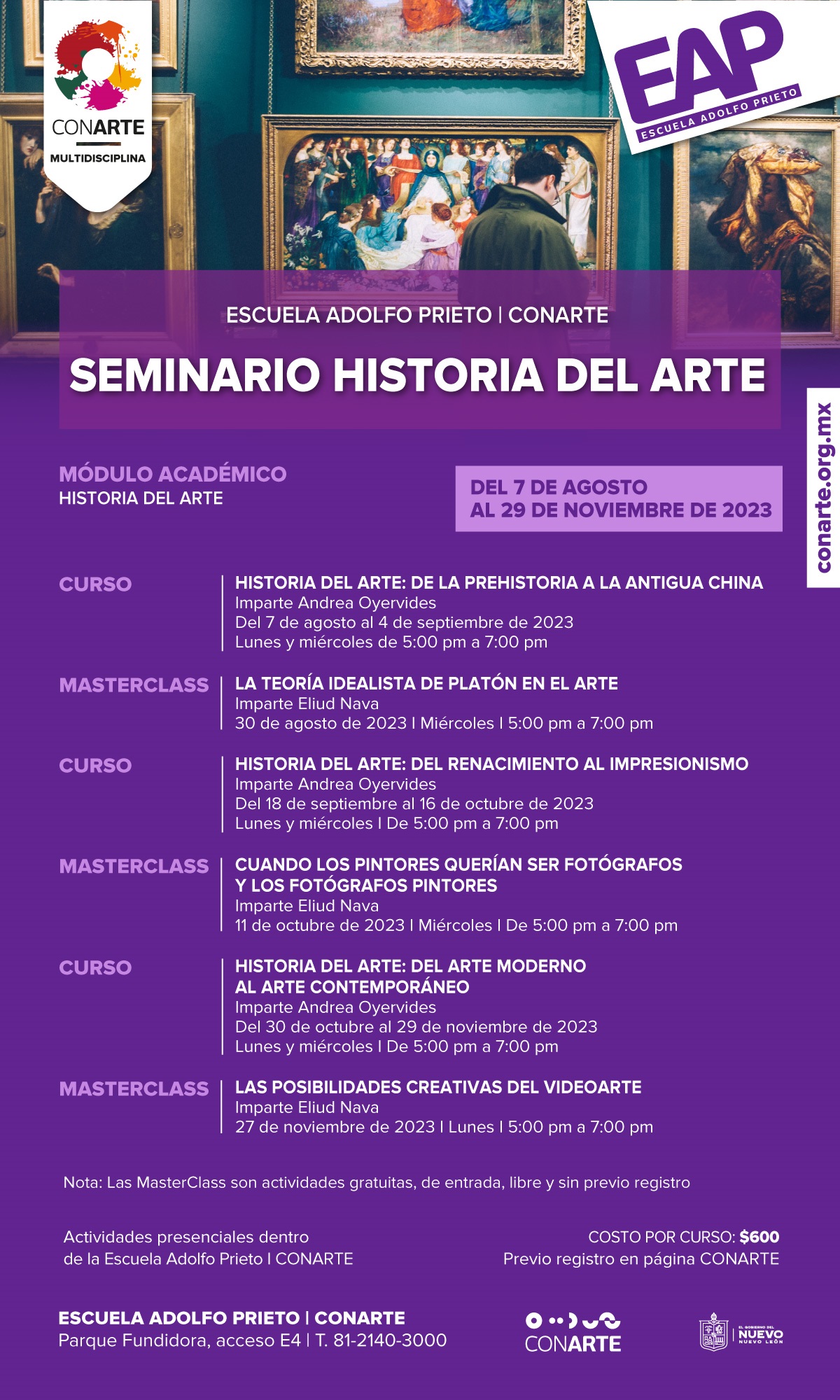 El seminario está dirigido a todo público y las inscripciones ya están disponibles en www.conarte.org.mx, la cuota de recuperación por cada curso es de 600 pesos, mientras que las clases magistrales serán gratuitas. Reserva tu lugar en: www.tiendaconarte.org.mx  Sigue CONARTE @conartenl