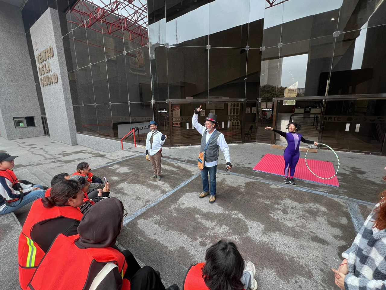 Al exterior del Teatro y en vestíbulo, el público disfrutó “El teatro de los misterios y las maravillas”, texto y dirección de David Colorado, inspirado en Aurorita, Centavito y Medio kilo, un grupo de payasos de barrio que visitaban diferentes colonias desde el centro de Monterrey hasta lo más profundo de municipios como Guadalupe y Juárez.