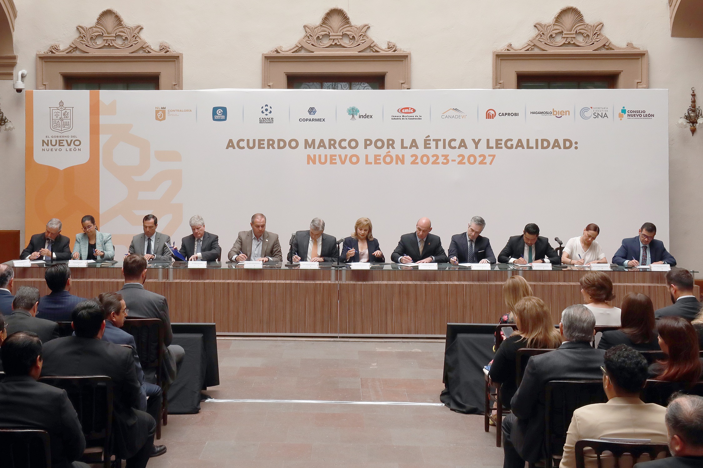 Monterrey, Nuevo León.- Con la firme intención de crear una sociedad integra el Gobierno del Estado, a través de la Contraloría y Transparencia Gubernamental firmó el Acuerdo por la Ética y la Legalidad Nuevo León 2023-2027, con las cámaras empresariales y organismos internacionales.
