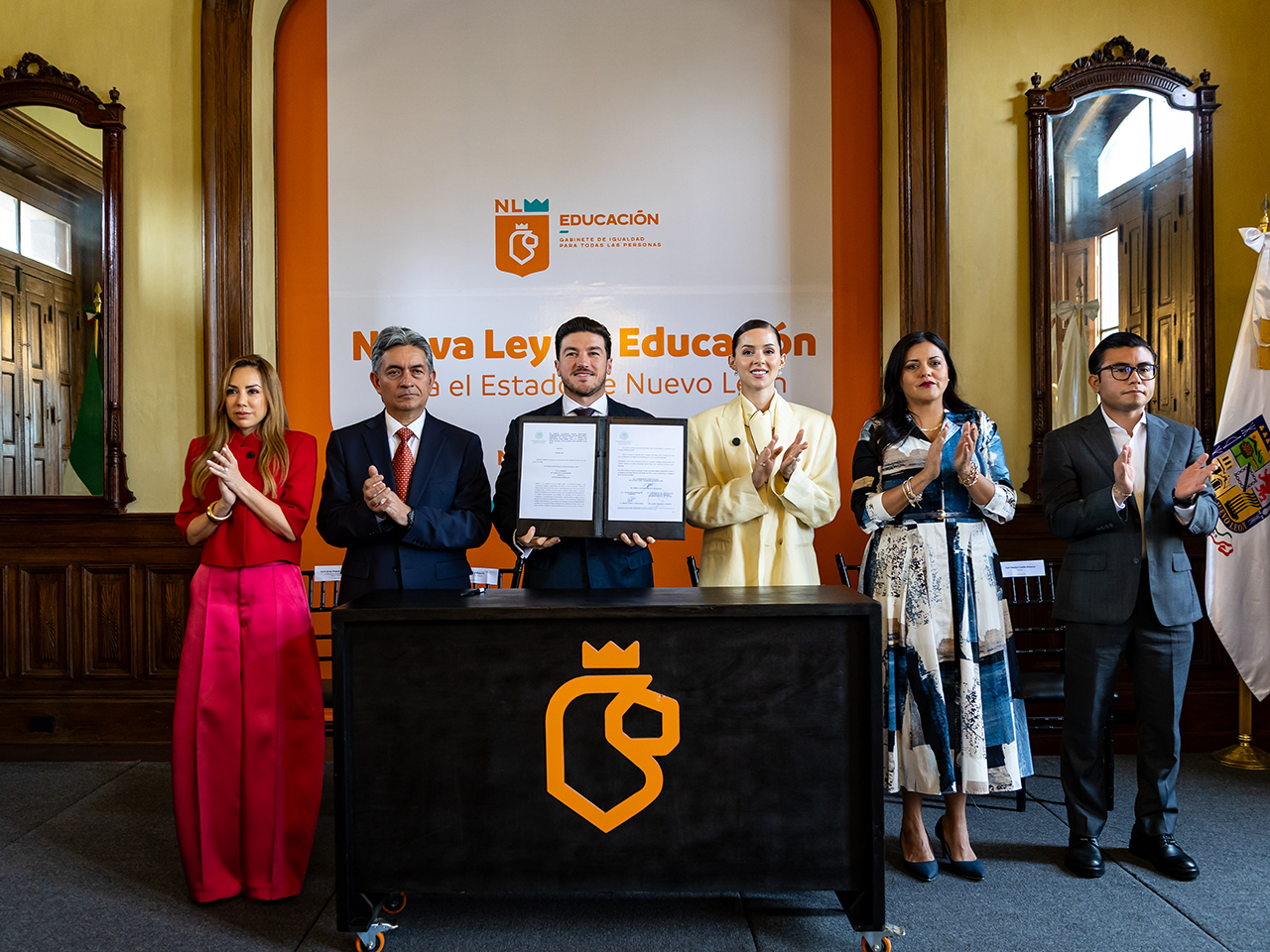 Monterrey, Nuevo León.- El Gobernador Samuel Alejandro García Sepúlveda firmó este lunes para su publicación, la nueva Ley de Educación para el Estado de Nuevo León, ordenamiento que calificó como referente nacional y en donde destacó el apartado de la inclusión.
