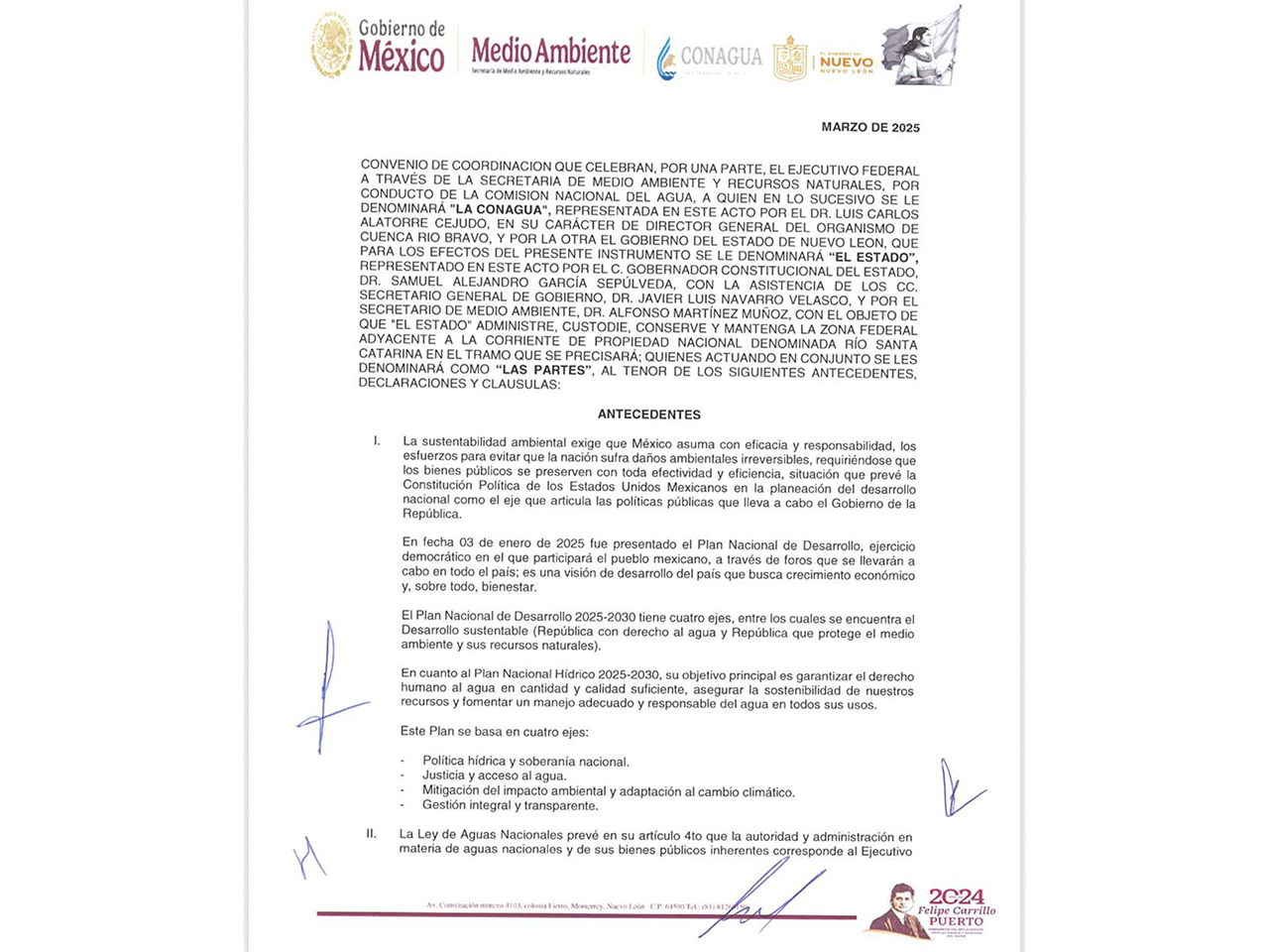 Firman Convenio CONAGUA y Gobierno del Estado para custodia de Río Santa Catarina
