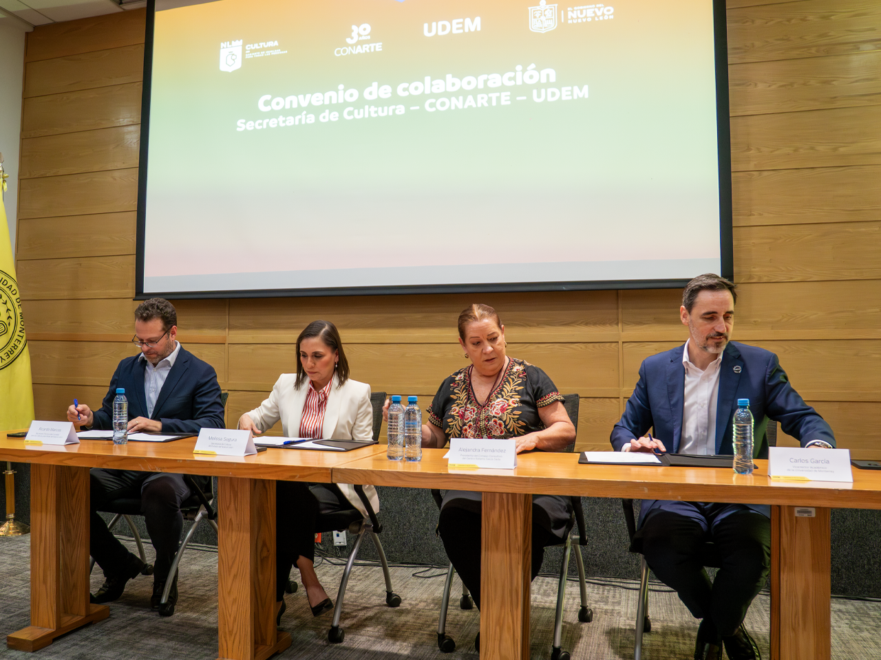 Melissa Segura Guerrero, Secretaria de Cultura de Nuevo León; Ricardo Marcos González, Secretario Técnico de CONARTE; Carlos García González, Vicerrector Académico de la UDEM y Alejandra Fernández Garza, presidenta del Consejo del Centro Roberto Garza Sada de la institución educativa, signaron el convenio en el que se establecen las bases de la cooperación.