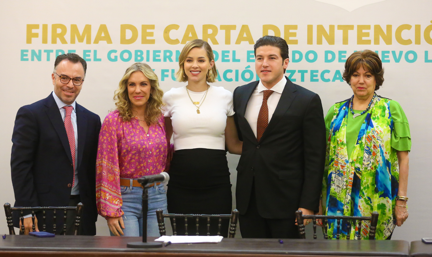 El acuerdo fue firmado por el Gobernador Samuel Alejandro García Sepúlveda y Mariana Rodríguez, de Amar a Nuevo León; Sofialeticia Morales Garza, Secretaria de Educación; Ninfa Salinas Sada, presidenta del Consejo de Fundación Azteca; y Antonio Domínguez Sagols, Director General de Fundación Azteca.