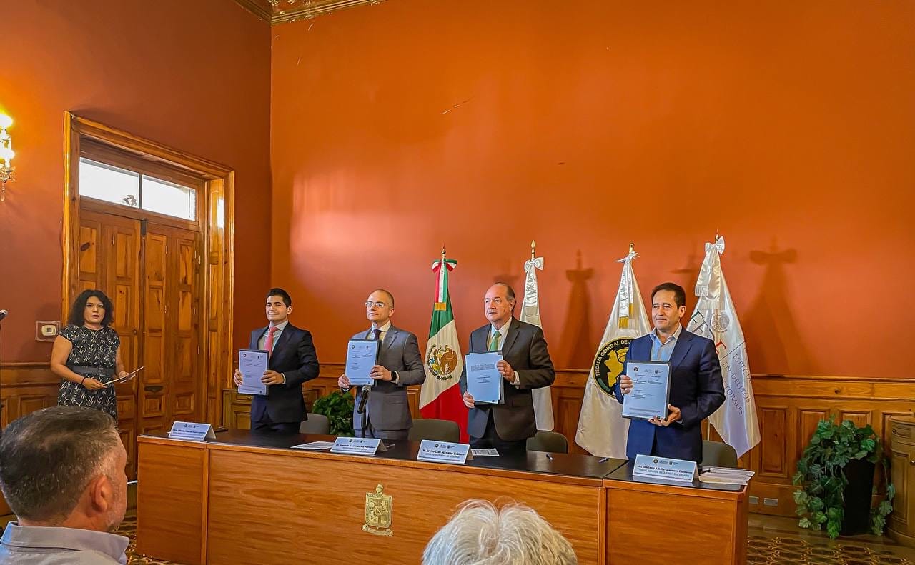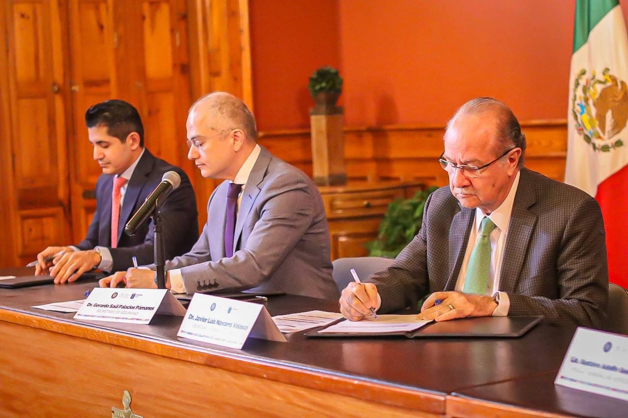 Los titulares de estas instituciones, acompañados por el Secretario General de Gobierno, Javier Navarro Velasco, signaron el acuerdo en el Salón Rojo del Palacio de Cantera.