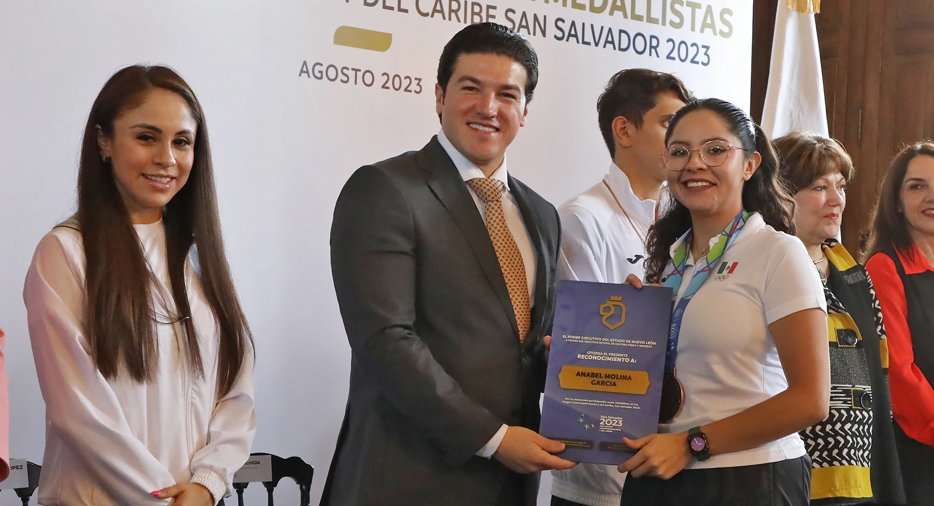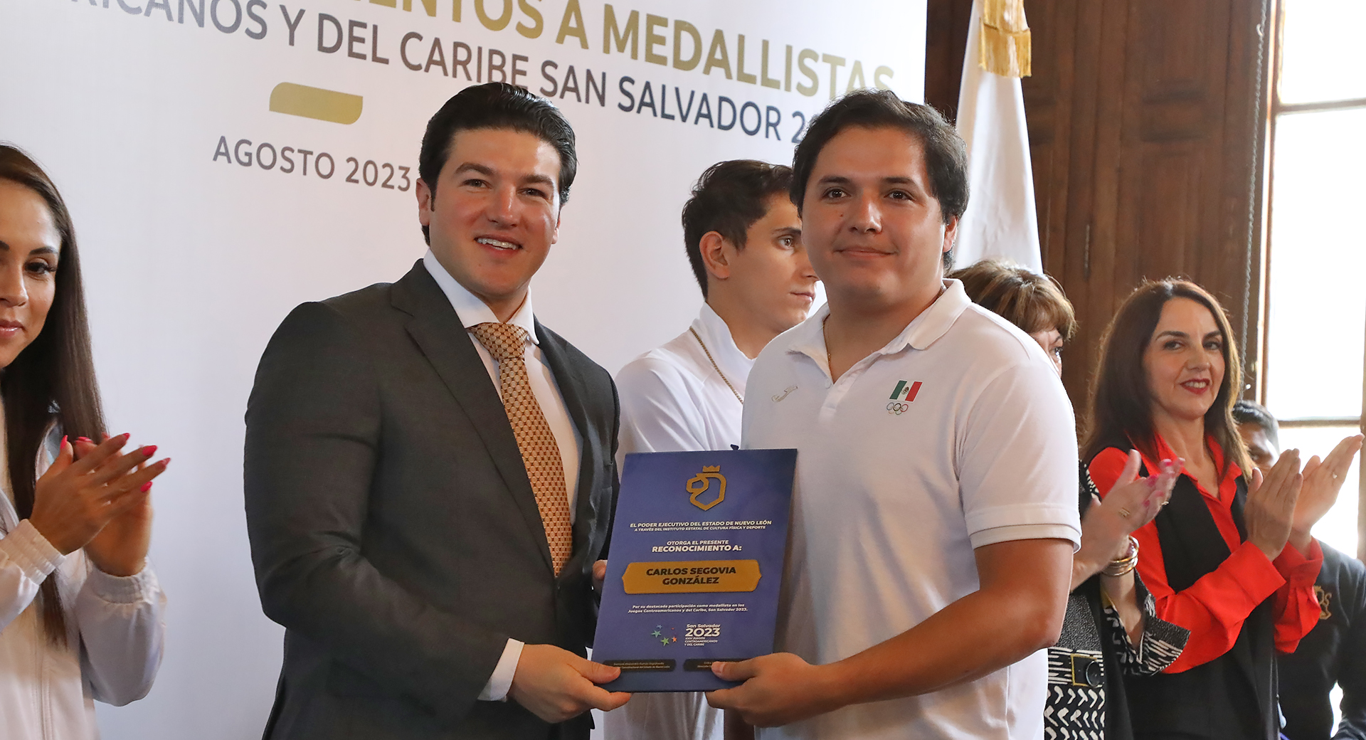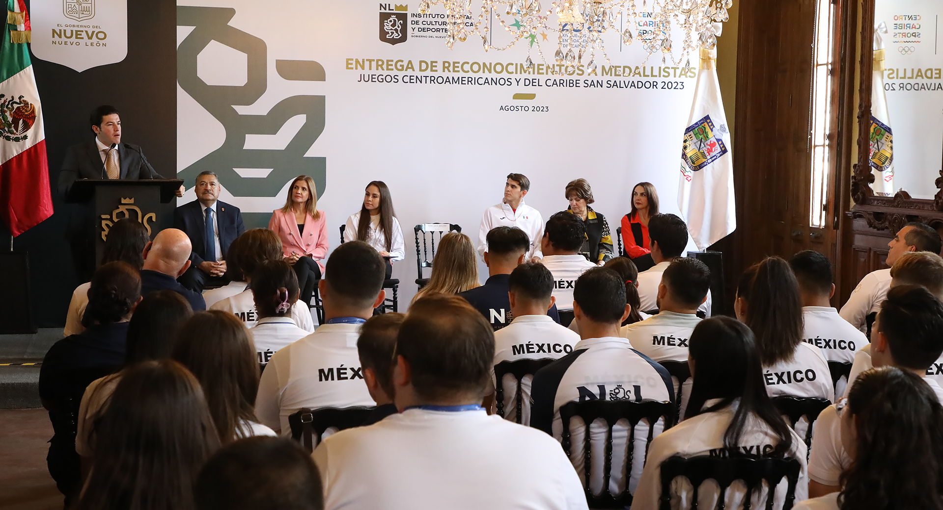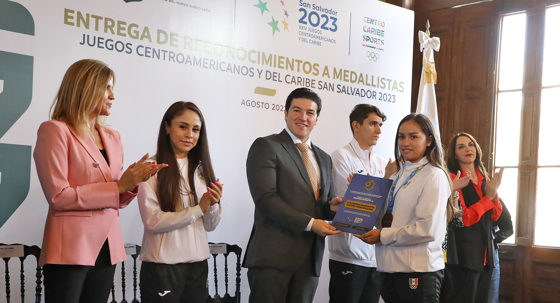 Monterrey, Nuevo León.- El Gobernador Samuel Alejandro García Sepúlveda entregó reconocimientos a las y los deportistas que representaron a Nuevo León en los Juegos Centroamericanos y del Caribe en San Salvador 2023, en donde lograron 74 medallas; 32 de oro, 19 de plata y 23 de bronce.