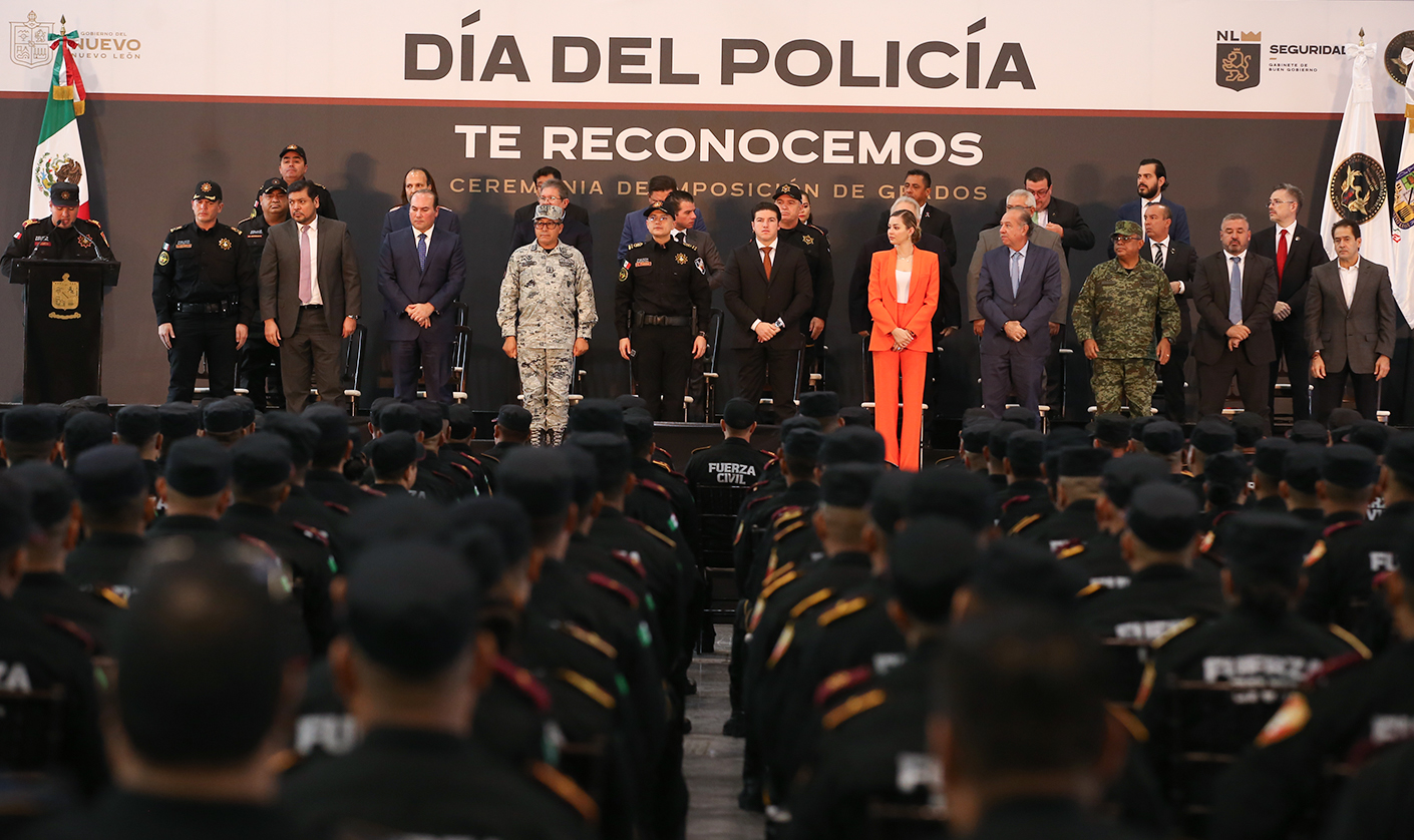 Asimismo se impusieron grados a nueve policías heridos en cumplimiento de su deber; y la imposición de 407 ascensos que fueron entregados por el Gobernador del Estado, Samuel García Sepúlveda.