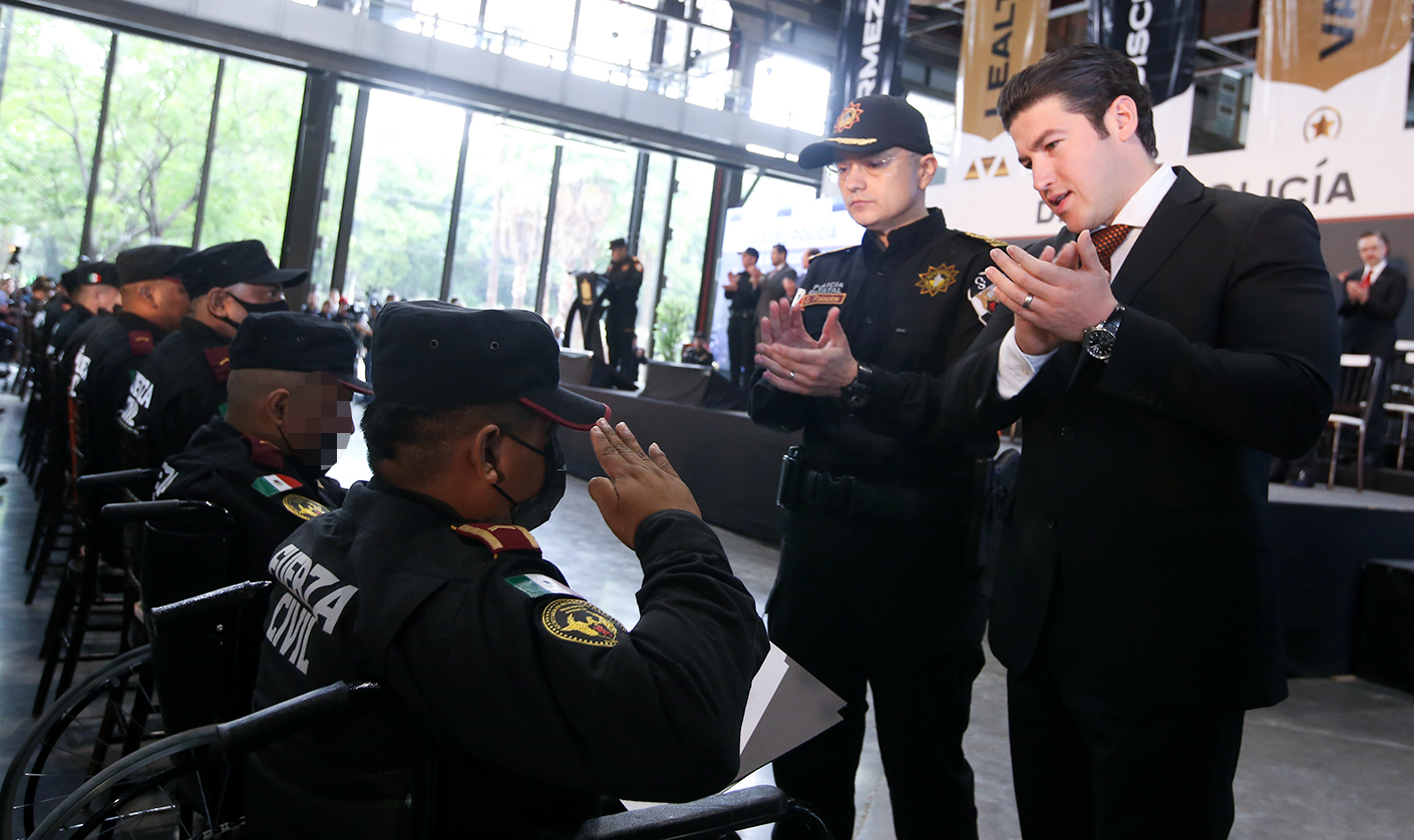 En la conmemoración del Día del Policía, el Gobernador Samuel Alejandro García Sepúlveda destacó la labor de las y los elementos de Fuerza Civil, a quienes dijo, elevará sus prestaciones para que mejoren su calidad de vida.
