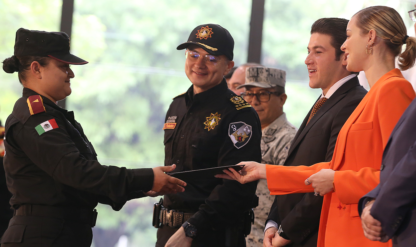Acompañado de Mariana Rodríguez, de Amar a Nuevo León, el Mandatario también otorgó ascensos y reconocimientos.