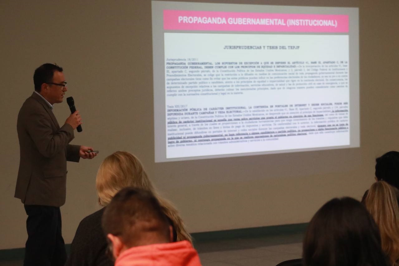 Julieta López, titular de la dependencia gubernamental, dio la bienvenida a José Ángel Medina Flores, vocal del INE, quien desarrolló una serie de temas relacionados sobre el deber ser de la difusión antes, durante y después de los comicios del 2 de junio.