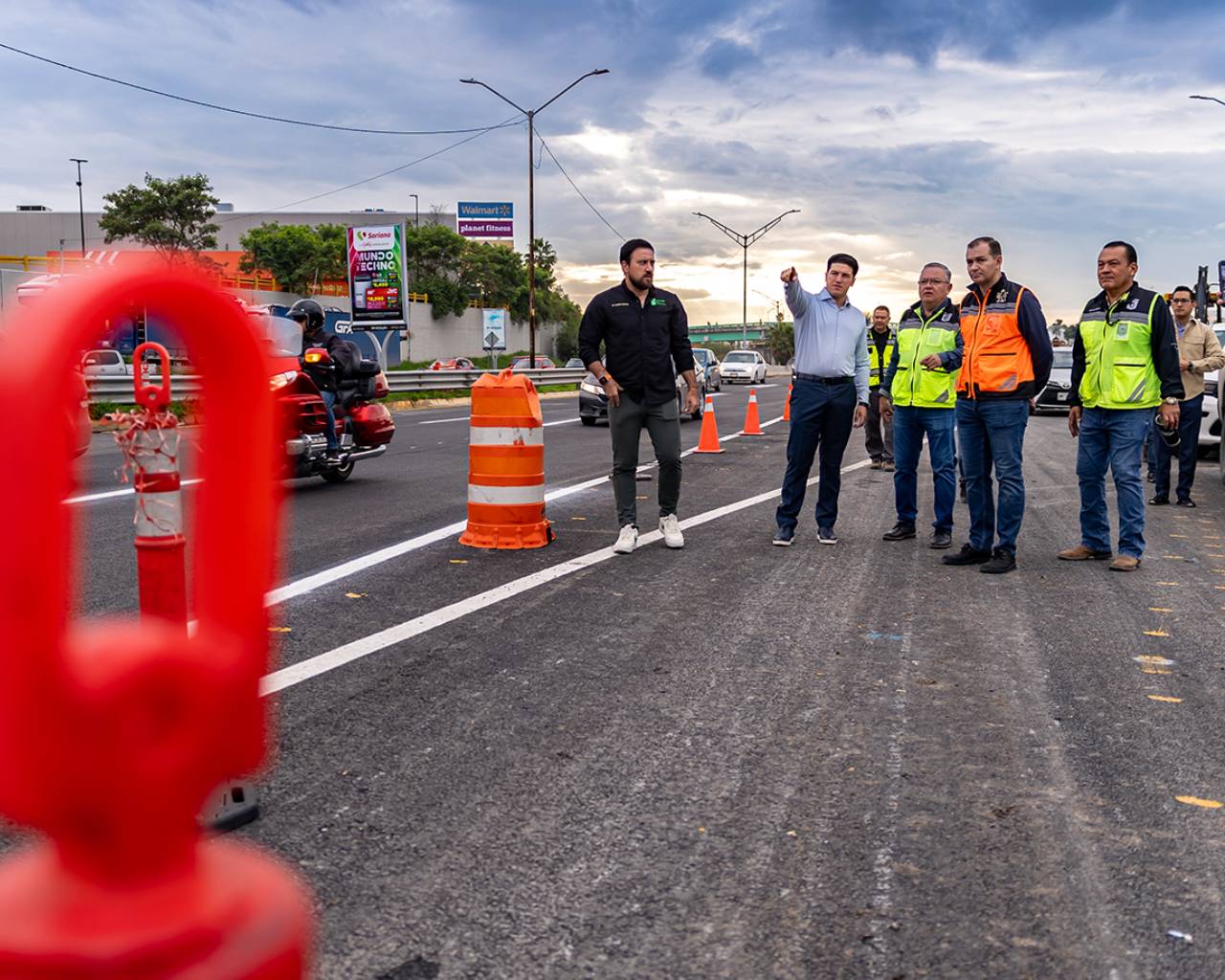 Acompañado de autoridades estatales, García Sepúlveda retiró los trafitambos para habilitar el carril central de avenida Miguel de la Madrid en incorporación al carril exprés de Constitución, que había sido restringido para el reforzamiento estructural del puente de la Gaza de Bonifacio Salinas.