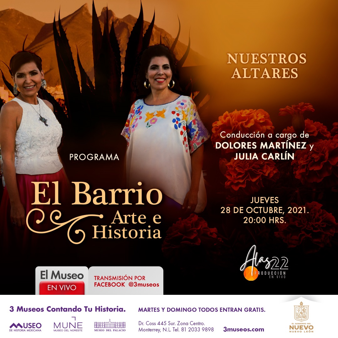 El jueves 28 de octubre a las 20:00 horas se transmitirá un programa especial de El Barrio: Arte e Historia – Nuestros Altares, en el cual sus conductoras Dolores Martínez y Julia Carlín visitarán mercados emblemáticos, como el Juárez y el Mesón Estrella en busca de los elementos para hacer un bello altar llenos de colores, sabores y aromas para recordar a los seres amados.