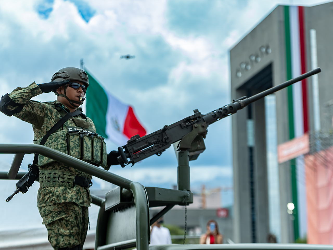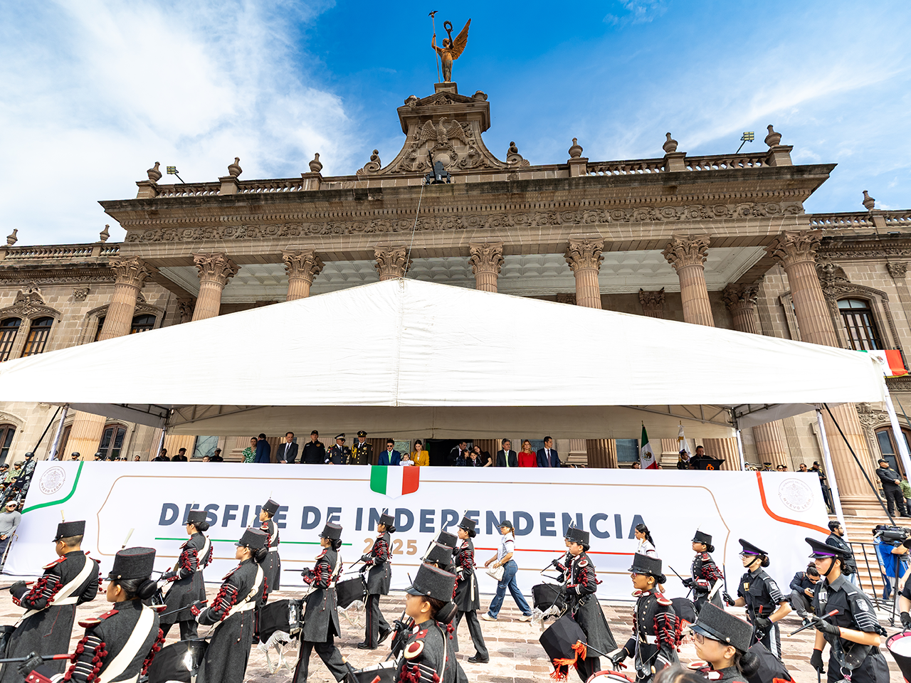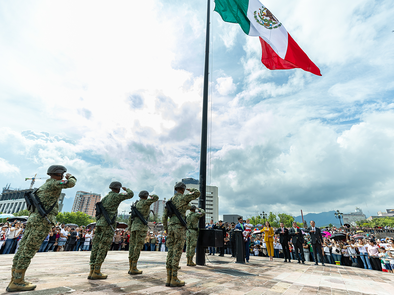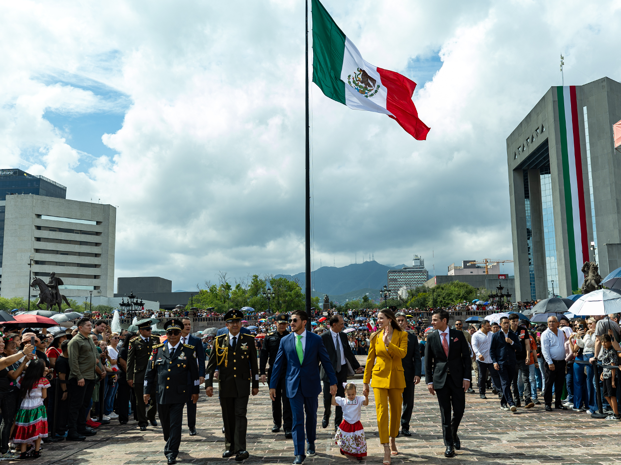 • Durante el Desfile Cívico el Gobernador de Nuevo León estuvo acompañado de Mariana Rodríguez Cantú; el Secretario General de Gobierno, Miguel Flores; mandos militares y funcionarios del Gabinete Estatal.