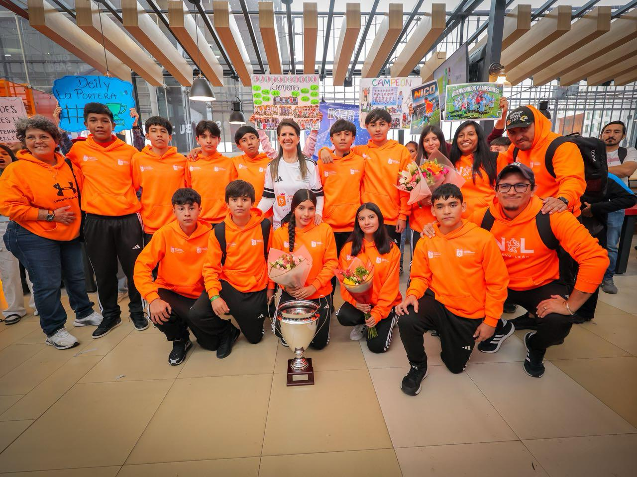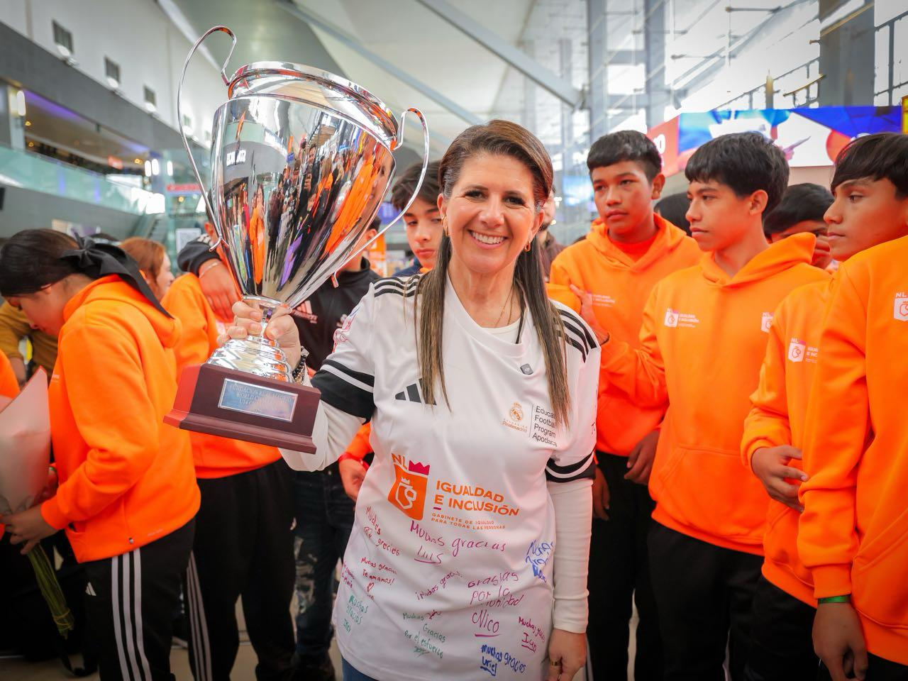 Monterrey, Nuevo León.- Luego de vivir una experiencia inolvidable tras obtener el primer lugar en el Torneo Amistoso de la Fundación Real Madrid, World Challenge 2026, las niñas y niños del Educational Football Program Nuevo León de Centros Comunitarios fueron recibidos por la Secretaria de Igualdad e Inclusión, Martha Herrera, y sus familias en el Aeropuerto Internacional de Monterrey.