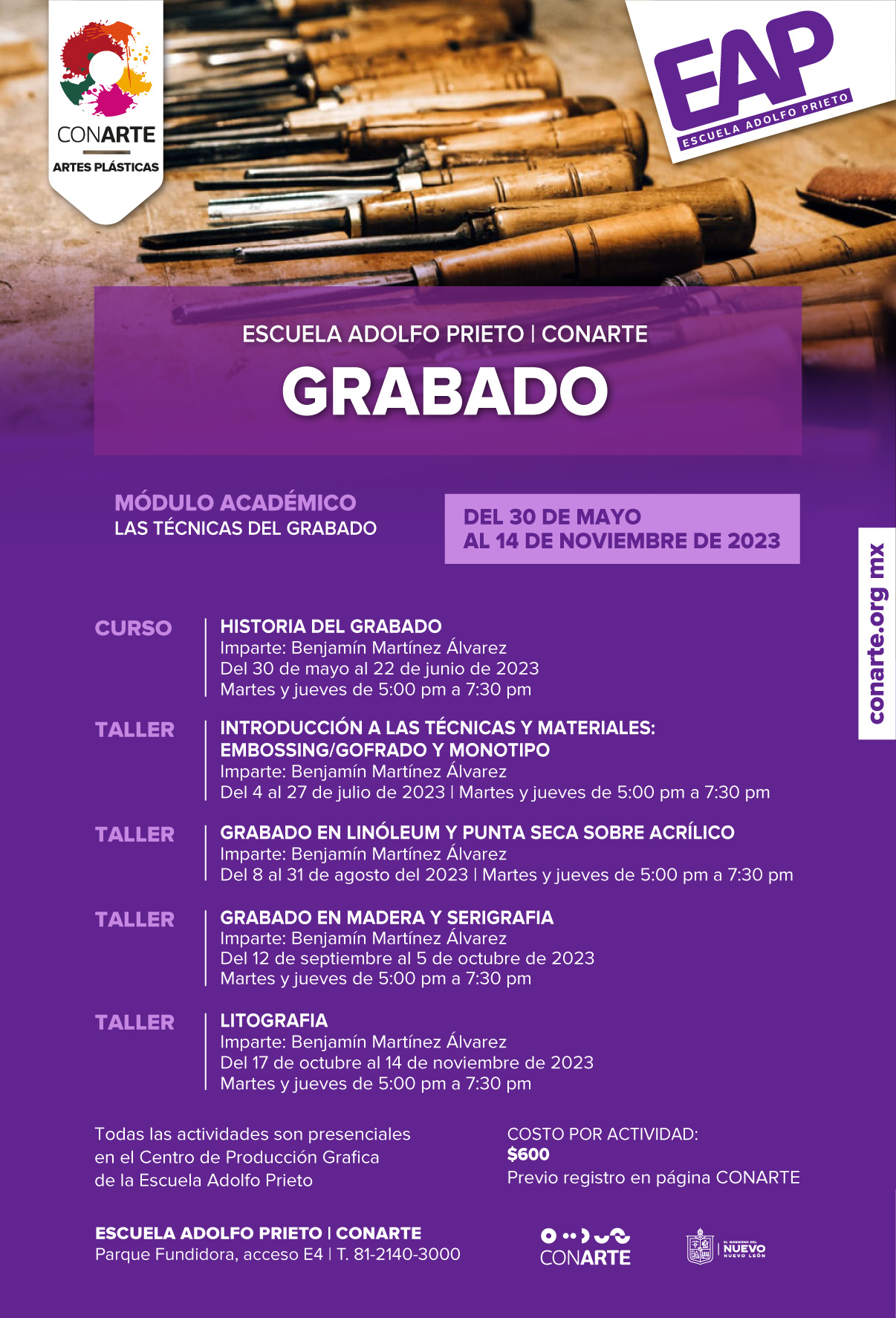 Cada actividad tiene una cuota de recuperación de 600 pesos. Todas las actividades se llevarán a cabo de forma presencial en el Centro de Producción Gráfica de la Escuela Adolfo Prieto CONARTE.