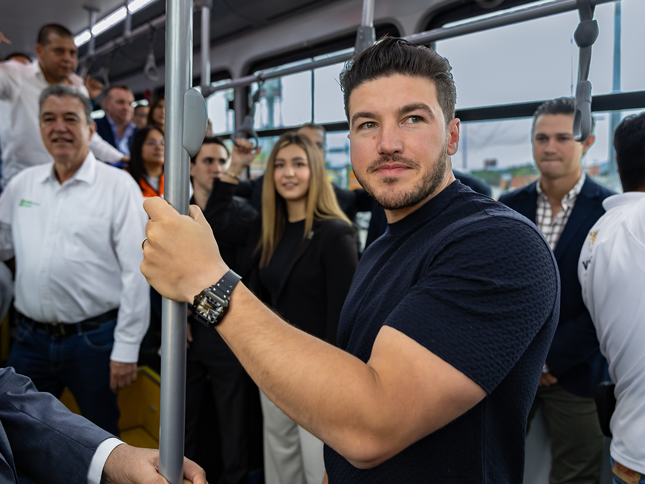 Acompañado del Secretario de Movilidad y Planeación Urbana, del director general de Metrorrey, Abraham Vargas, y del Rector de la UANL, el Gobernador abordó una de las unidades de Transmetro junto con estudiantes de la UANL y realizó un recorrido desde el Campus Mederos hasta la Macroplaza.