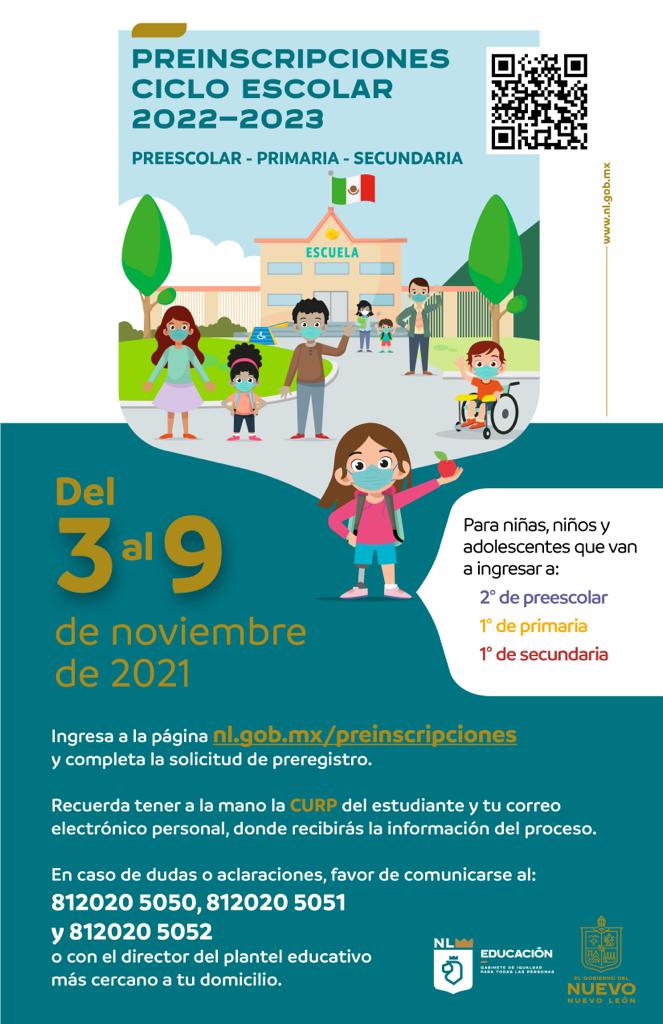 La Secretaría de Educación de Nuevo León informa que del 3 al 9 de noviembre del 2021, inicia en línea proceso de Preinscripción del ciclo escolar 2022-2023 en educación básica.