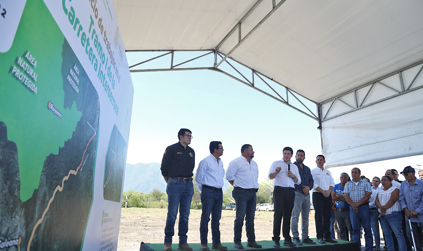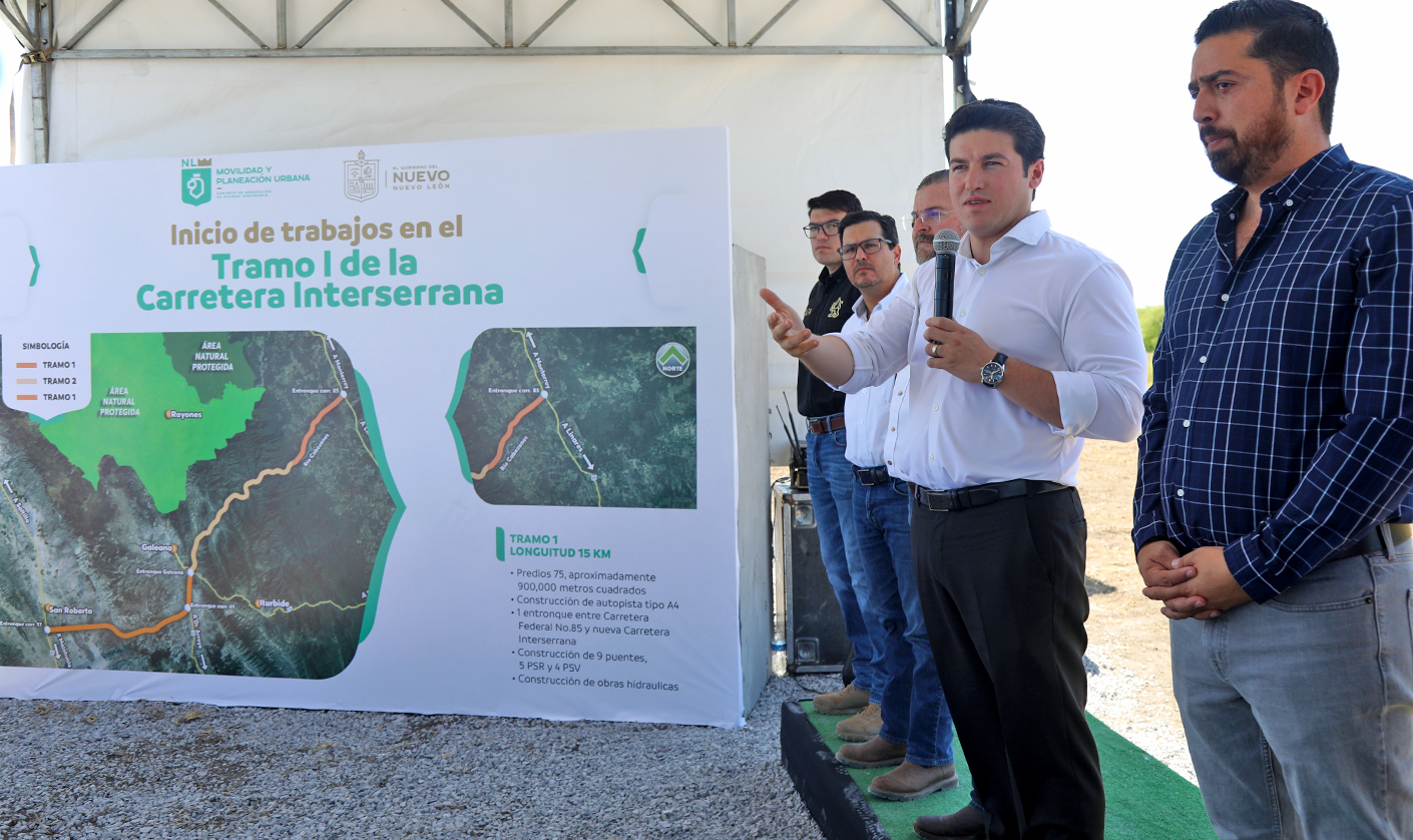 Montemorelos, Nuevo León.- El Gobernador Samuel Alejandro García Sepúlveda arrancó hoy los trabajos en la construcción del Tramo 1 de la Carretera Interserrana, con lo que el proyecto insignia del sistema carretero de Nuevo León de esta administración va en forma para cristalizar el sueño de conectar el sur del Estado con la zona metropolitana de Monterrey.