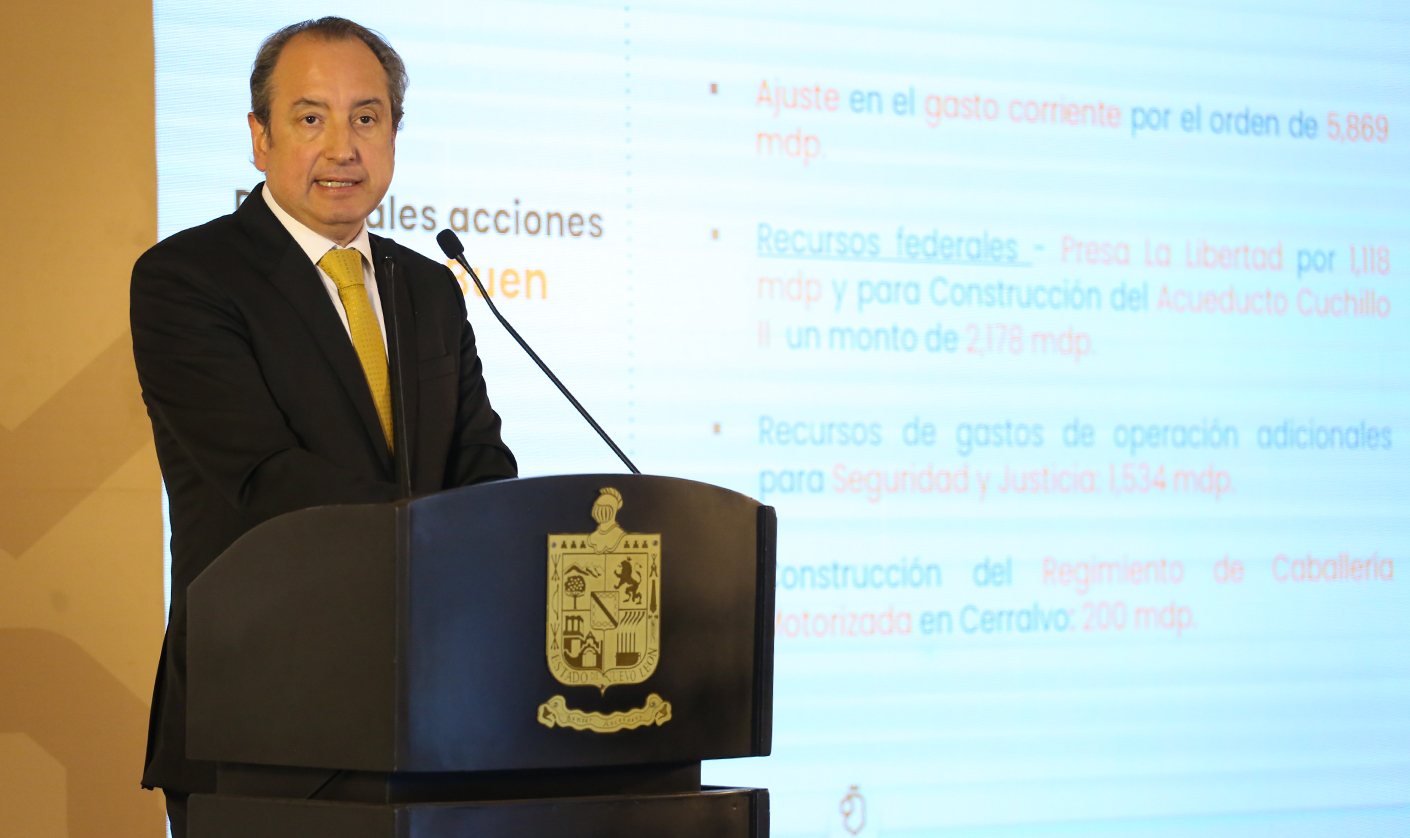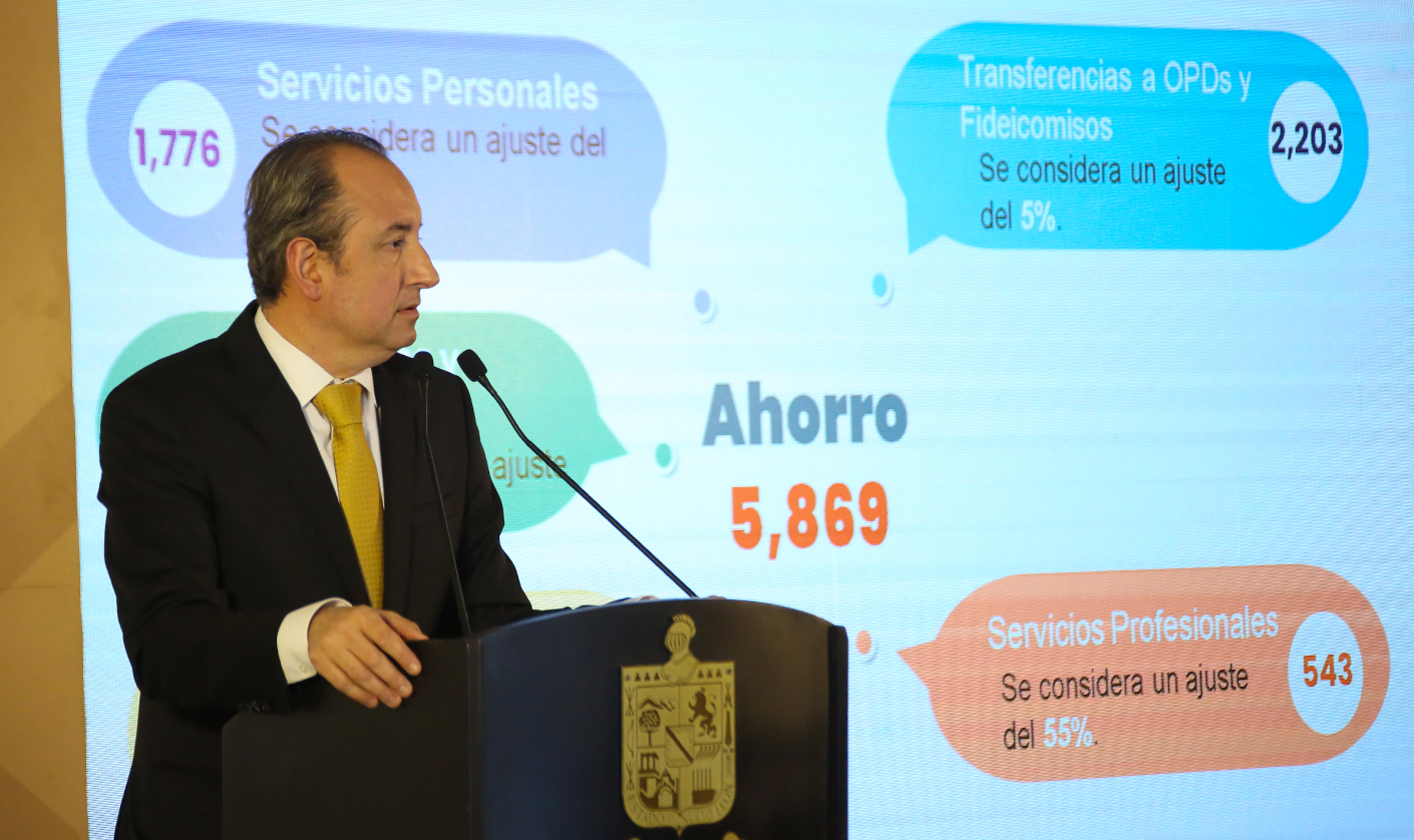 Igualmente, el Secretario de Finanzas y Tesorero General del Estado anunció que se propuso un ajuste en el gasto corriente por 5 mil 869 millones de pesos, en servicios personales, servicios generales, materiales y suministros, servicios profesionales y transferencias a organismos públicos descentralizados y fideicomisos.