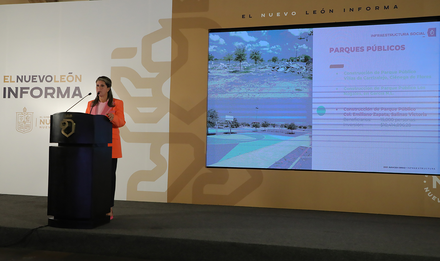 Destacó las obras de los parques públicos realizados en los municipios de Ciénega de Flores, García y Salinas Victoria, así como la primera etapa que se pondrá en marcha para la construcción del que estará ubicado en General Escobedo.