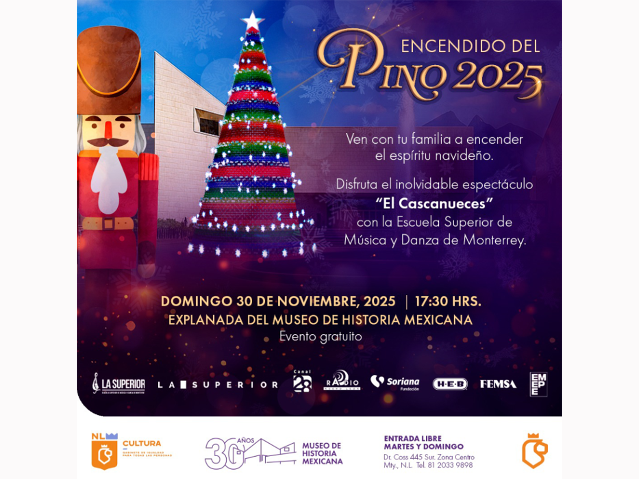Monterrey, Nuevo León.- Hay noches tan mágicas que solo suceden en Navidad. Por ello, el Museo de Historia Mexicana invita a las familias nuevoleonesas a reunirse en torno a una de las tradiciones más esperadas en el estado: el Encendido del Pino, acompañado del espectáculo El Cascanueces, a cargo de la Escuela Superior de Música y Danza de Monterrey, el domingo 30 de noviembre, a partir de las 17:30 horas.
