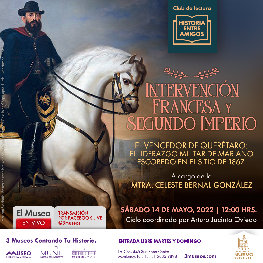 El general Escobedo encabezó la estrategia militar del presidente Juárez durante la invasión francesa, la cual fue decisiva para el triunfo republicano que marcaría una nueva etapa para México, sobre ello disertará la Maestra Celeste Bernal González, en la conferencia virtual El vencedor de Querétaro: el liderazgo militar de Mariano Escobedo en el sitio de 1867, el sábado 14 de mayo a las 12:00 en la página de Facebook de 3 Museos.