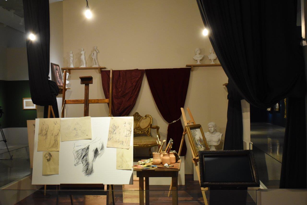 En este espacio se aprecia una ambientación inspirada en las fotografías de los salones de pintura y escultura de la Academia de finales del siglo XIX.