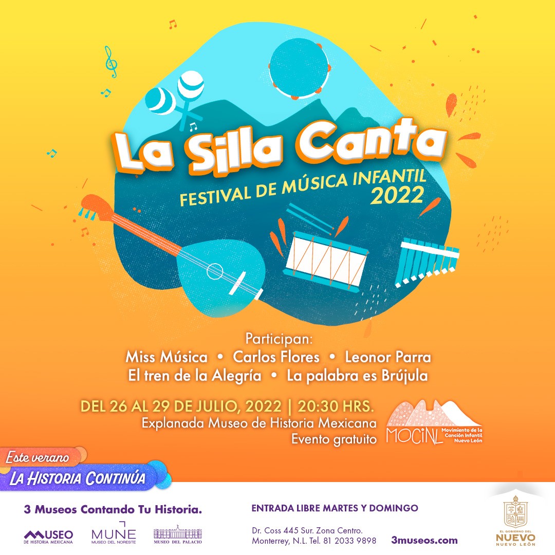 Una gran demostración del talento musical dedicado a cantar a la niñez que existe en Nuevo León se hará presente con su música, sus personajes y divertidos juegos en el Festival de Música Infantil La Silla Canta, del 26 al 29 de julio a las 20:30 horas, en la explanada del Museo de Historia Mexicana.