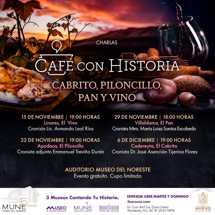 3 Museos y la Asociación Estatal de Cronistas Municipales de Nuevo León “José P. Saldaña” invitan al ciclo Café con Historia. Cabrito, piloncillo, pan y vino, para conocer el patrimonio gastronómico que da identidad y renombre a los municipios de Linares, Apodaca, Villaldama y Cadereyta; los martes a partir del 15 de noviembre a las 19:00 horas en el auditorio del Museo del Noreste.