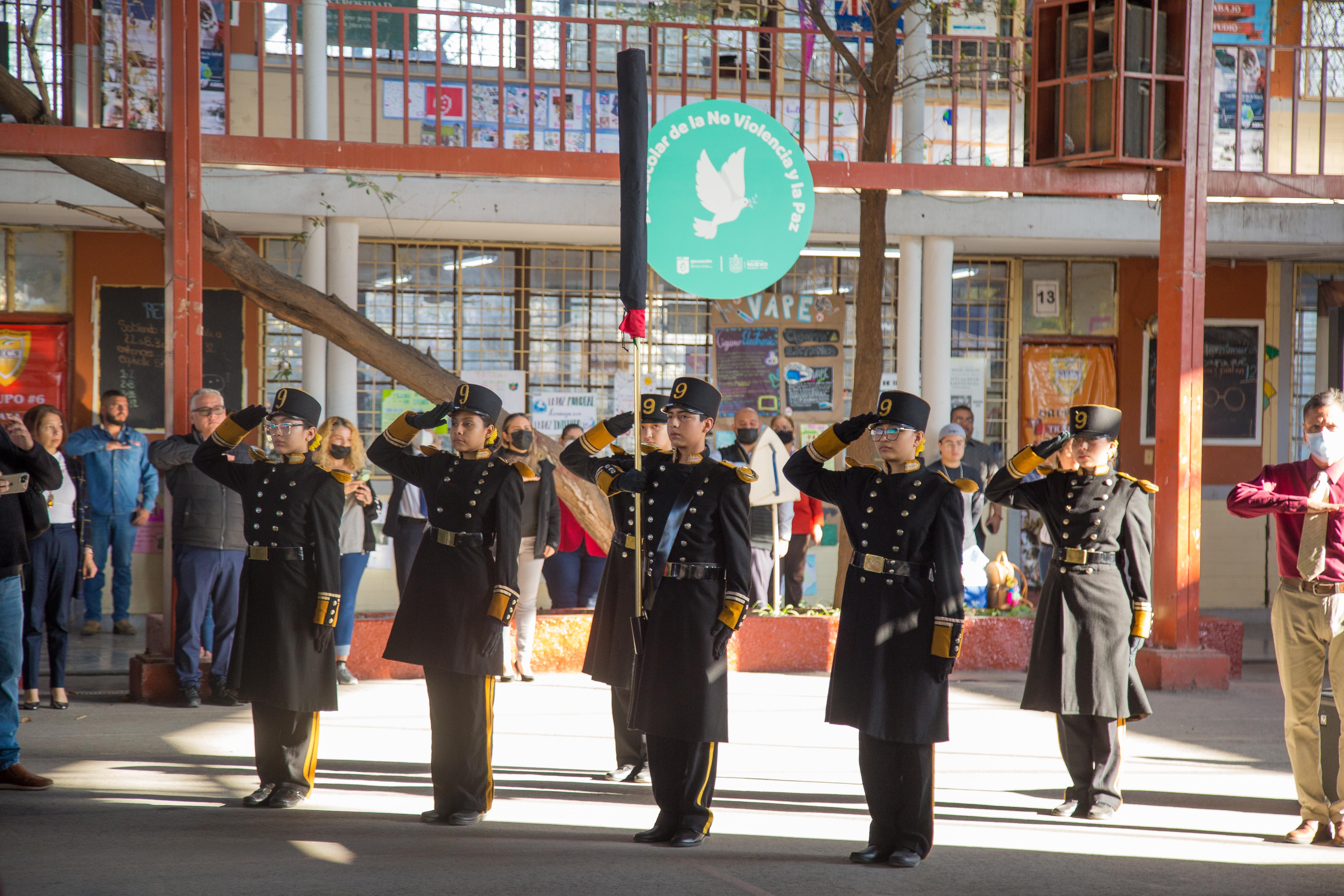 Durante la ceremonia de Honores a la Bandera en la Secundaria No. 9 “Miguel Hidalgo”, la Secretaria de Educación, Sofialeticia Morales Garza, destacó la importancia de promover la comunicación y la resolución pacífica de conflictos, así como de ayudar a los estudiantes a aprender a expresar sus pensamientos y sentimientos de manera clara y respetuosa, y a encontrar soluciones pacíficas a los problemas que surgen en la escuela.