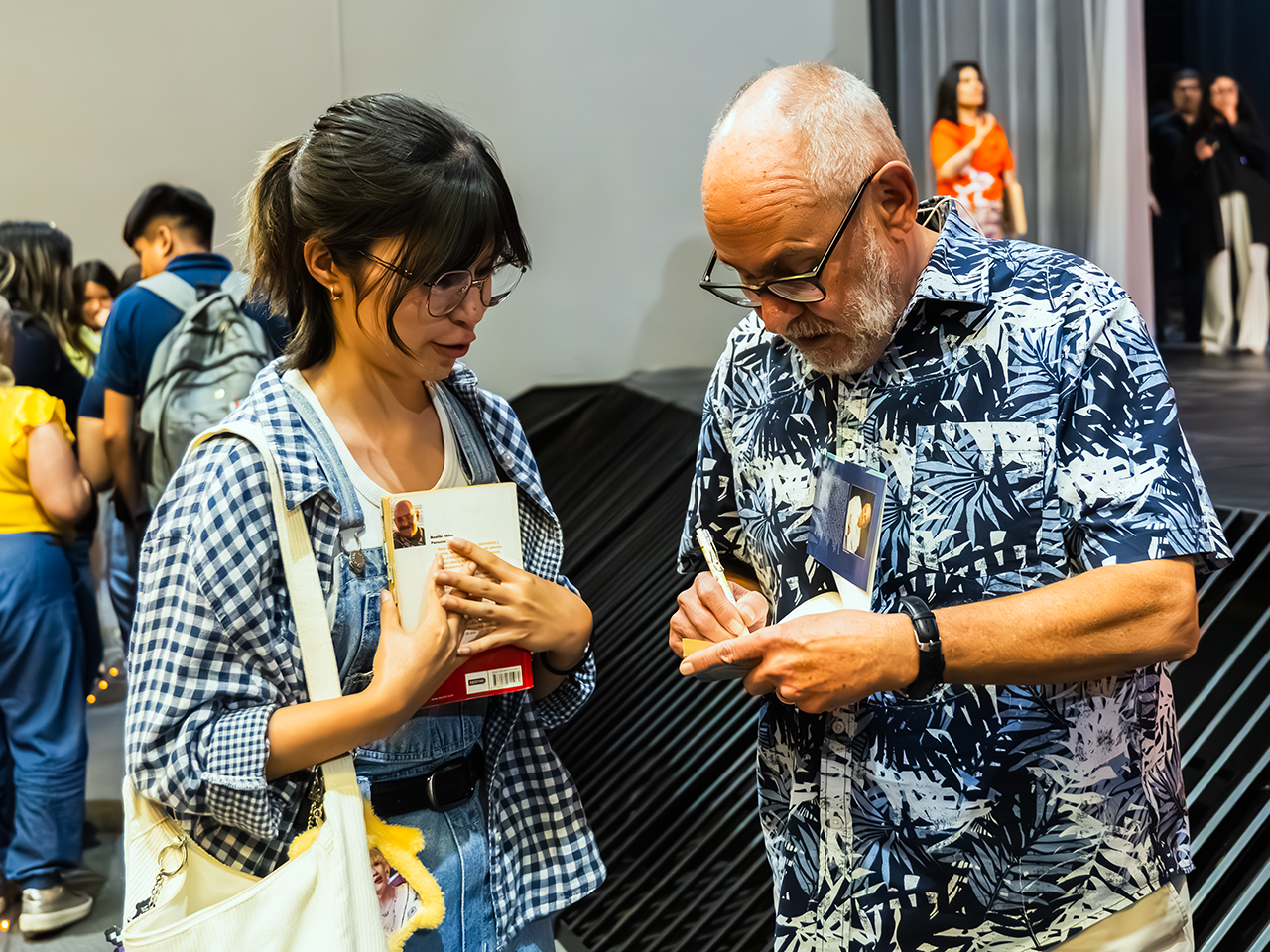 El evento, titulado “Booktags para lecturas compartidas”, contó con la presencia en el diálogo por dos jóvenes que, desde sus redes sociales, tienen numerosos seguidores atentos a sus recomendaciones editoriales: Alejandra Arévalo y a Rodrigo Unda. Al final, muchos de los jóvenes que ya conocían su obra se acercaron a pedirle la firma de sus libros, petición a la que el autor acepto gustoso.