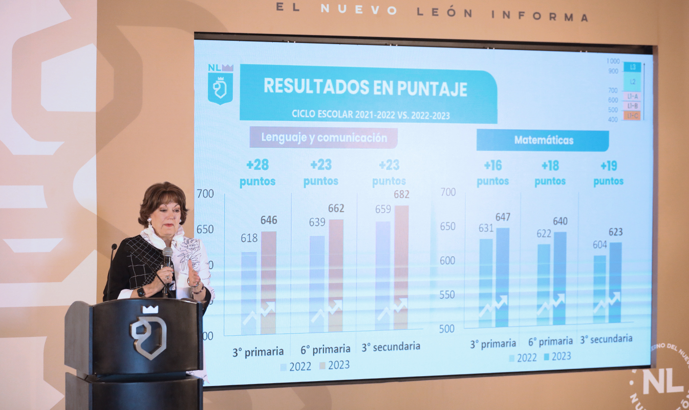 Monterrey, Nuevo León.-  Después de dos ciclos escolares evaluados, el programa “Nuevo León Aprende”, implementado al inicio de la administración, ha evidenciado una mejora significativa en las habilidades de lenguaje, comunicación y matemáticas de los estudiantes de Educación Básica, registrando un incremento promedio de 25 puntos en lenguaje y comunicación, y 19 puntos en matemáticas.