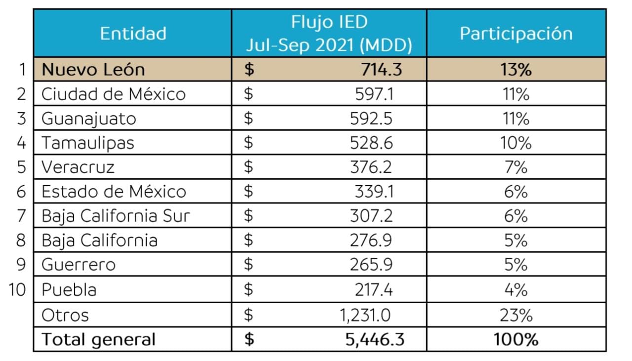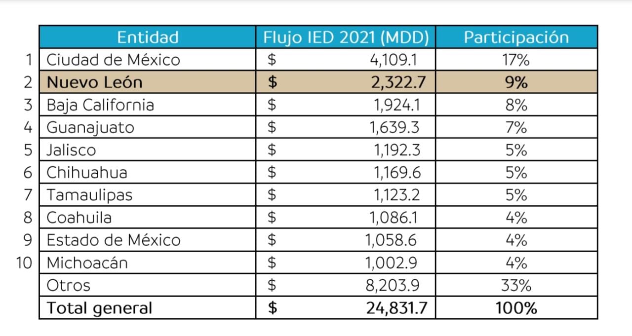 De igual manera, durante los primeros nueve meses del 2021, Nuevo León encabeza el listado de las entidades federativas que captaron mayor IED en México, tan solo después de la Ciudad de México, con un fIujo total de 2 mil 322.7 millones de dólares, representando el 9 por ciento de la inversión captada a nivel nacional en ese periodo.