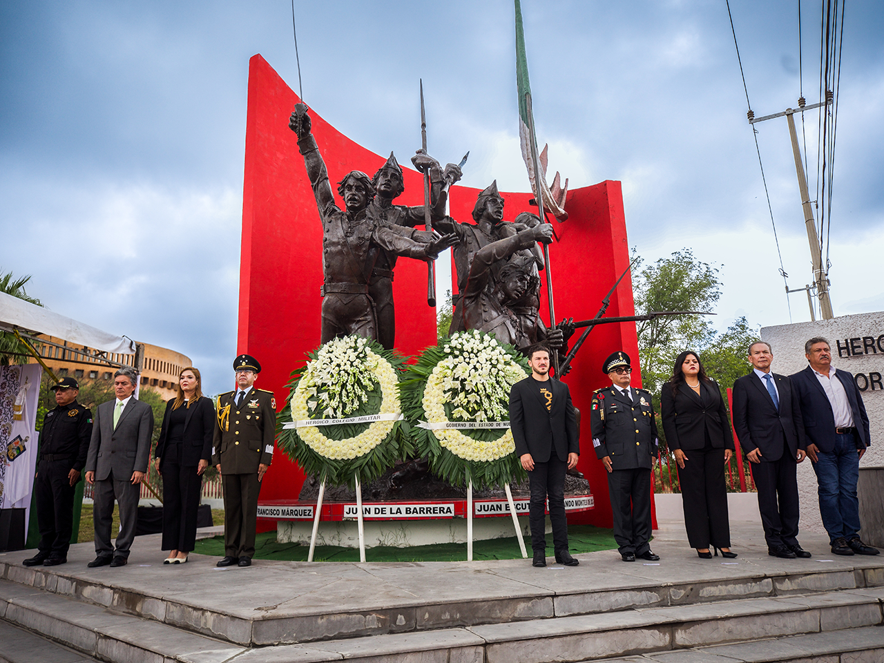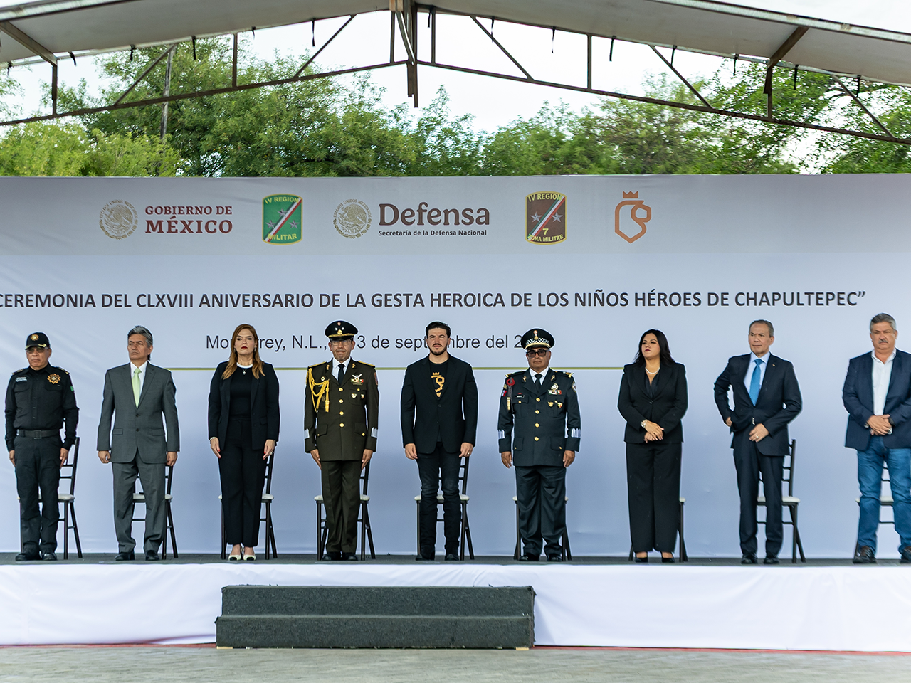 En la ceremonia cívica estuvieron el General Ramiro Ramírez López, Comandante de la Cuarta Brigada de Policía Militar y Coordinador estatal de la Guardia Nacional en Nuevo León; el Comisario Óscar Benítez en representación de la Secretaria de Seguridad Pública del Estado; la presidenta del Tribunal Superior de Justicia del Estado, Laura Córdova; la presidenta del Congreso del Estado, diputada Itzel Castillo; Héctor Gutiérrez, representante de la Secretaría de Gobernación en la entidad; y Guadalupe Sánchez Quiroz, Comisario general de la Secretaría de Seguridad de Monterrey.