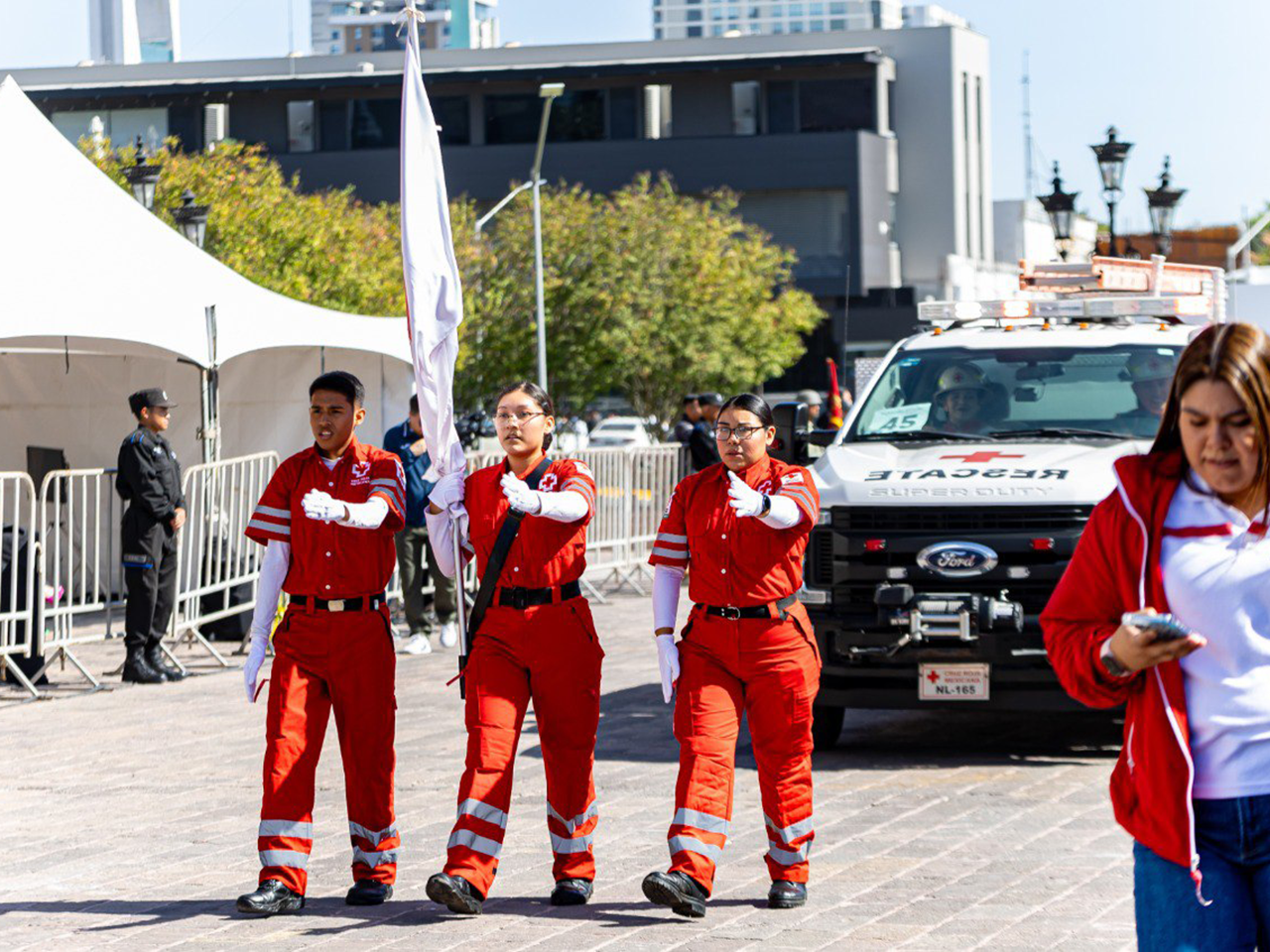 Acompañaron al Gobernador en el estrado Javier Navarro, Secretario General de Gobierno; Sofialeticia Morales, Secretaria de Educación; Gerardo Escamilla, titular de la Nueva Fuerza Civil; Melody Falco, directora General del INDE; el General Antonio Melchor Ruiz, Comandante de la 7ª Zona Militar; y el General Salvador Lorenzo Bautista, Comandante de la 4ª Brigada de Policía Militar y Coordinador Estatal de la Guardia Nacional en Nuevo León.