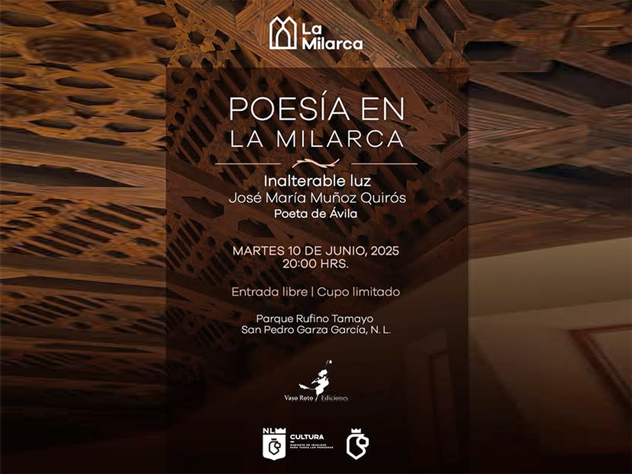 El recital del “Poeta de Ávila”, José María Muñoz Quirós, en Poesía en La Milarca tendrá entrada libre, pero el cupo es limitado. Para más información, pueden consultar la página web www.museolamilarca.mx o las redes sociales Facebook, Instagram y TikTok como @museolamilarca, así como las redes sociales de Vaso Roto Ediciones.