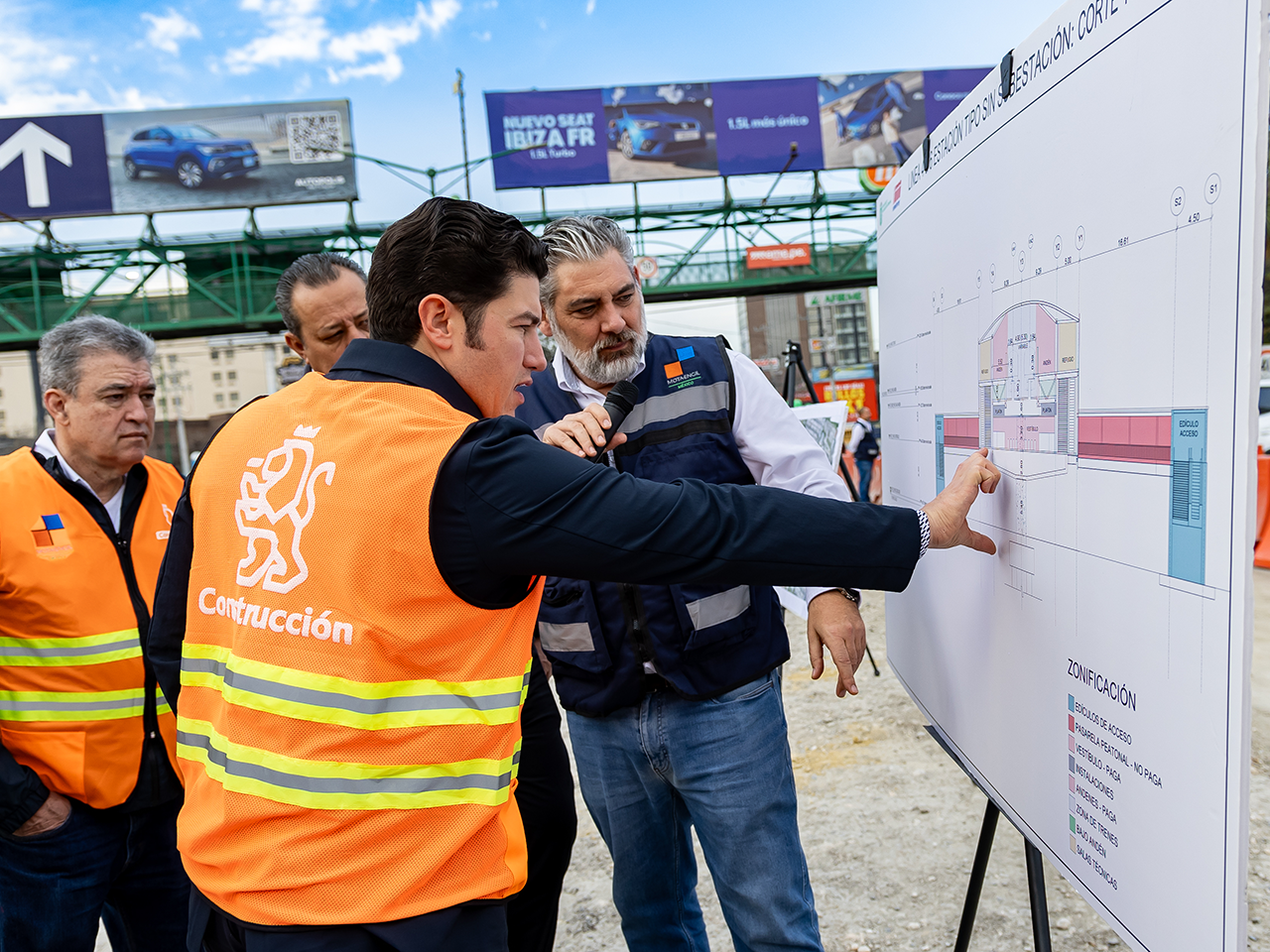 Acompañaron al Gobernador el Secretario de Movilidad y Planeación Urbana; Hernán Villarreal Rodríguez; el director General del Sistema de Transporte Colectivo Metrorrey, Abraham Vargas Molina; el director de Mota-Engil, Marcos Chico de la Felicidad; y Julián Barrera, Gerente de Construcción.