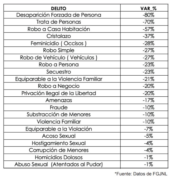 Derivado de las acciones del Grupo de Coordinación para la Seguridad del Estado, integrado por Ejército Mexicano, Guardia Nacional, Fuerza Civil y las Fiscalías estatal y federal; en conjunto con la Estrategia de Seguridad de “Tres Pisos”, se ha logrado la disminución de diversos delitos, entre ellos, los de desaparición forzada y patrimoniales.