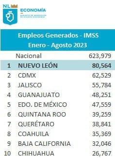 Monterrey, Nuevo León.- Con 80,564 puestos, Nuevo León es el estado donde más empleos se han creado de enero a agosto 2023 (acumulado anual), de acuerdo con datos del IMSS.