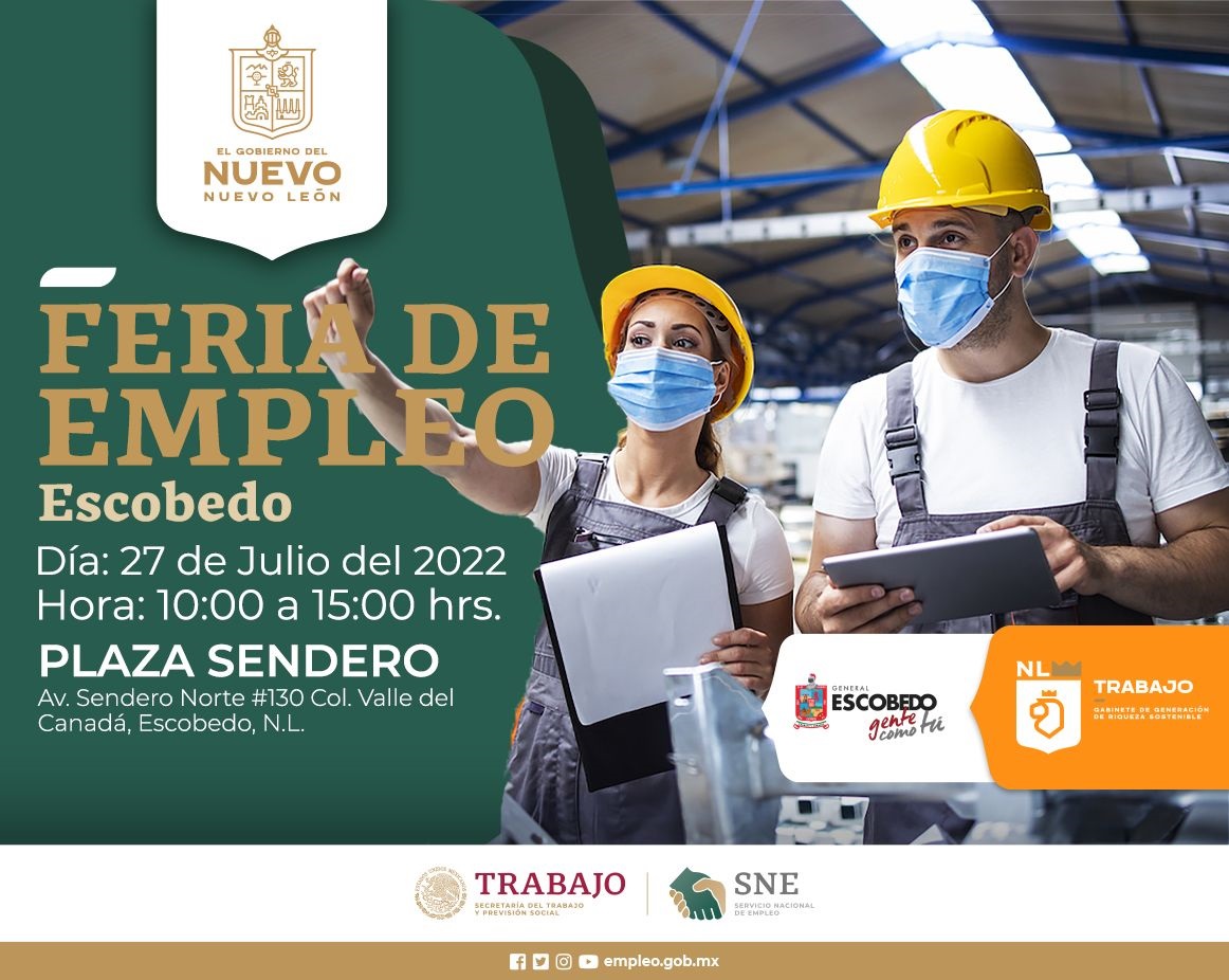 El 27 de julio se realizará la Feria del Empleo en Plaza Sendero del municipio de Escobedo de 10:00 de la mañana a 3:00 de la tarde donde se ofertarán más de 3 mil vacantes.