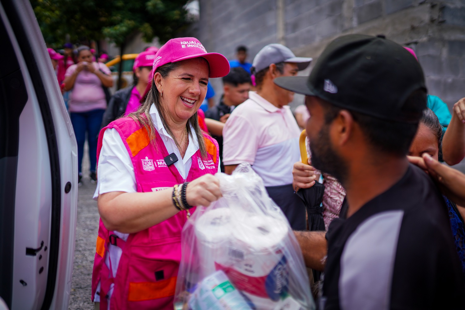 Al continuar con las acciones de atención a la población con un recorrido casa por casa, en este día por la colonia Gloria Mendiola en Monterrey, la Secretaria Martha Herrera, encabezó la entrega de apoyos alimentarios, paquetes de agua embotellada, kits de higiene personal, así como aparatos de movilidad.
