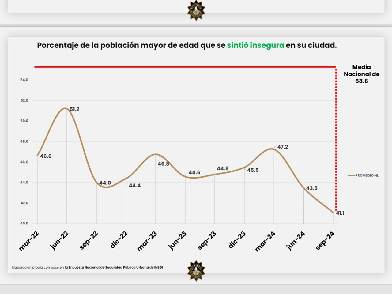 De acuerdo con datos de la encuesta, en marzo de 2024 Nuevo León se encontraba en una percepción de inseguridad de 47.2 puntos, posteriormente en junio de 2024 disminuyó a 43.5 y en la última encuesta de septiembre de 2024 volvió a disminuir llegando a 41.1.