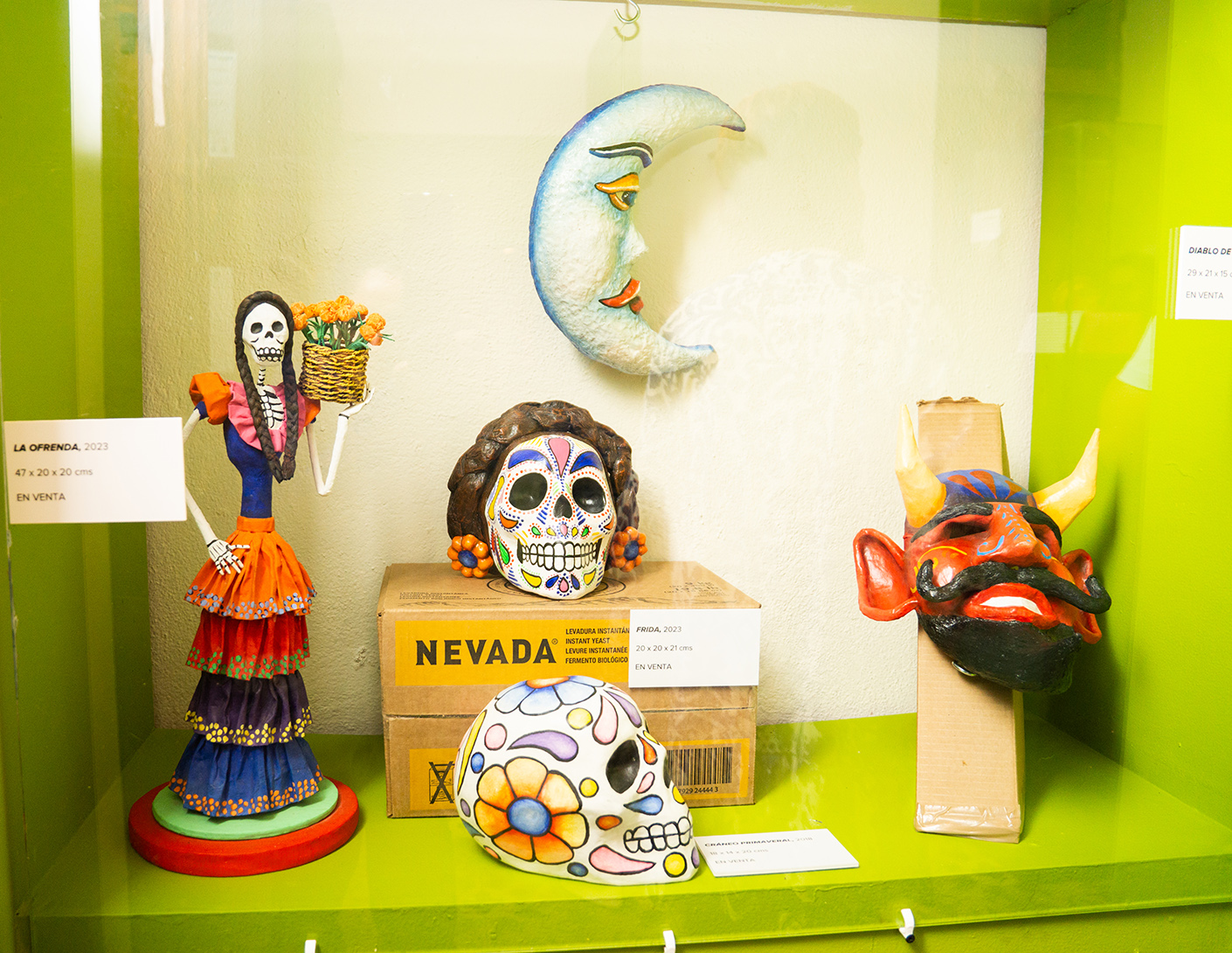 La exposición está conformada por una selección de 14 piezas que destacan por su colorido y muestra personajes de la cultura popular, animales, astros como el Sol y la Luna son algunas de las figuras que están presentes.