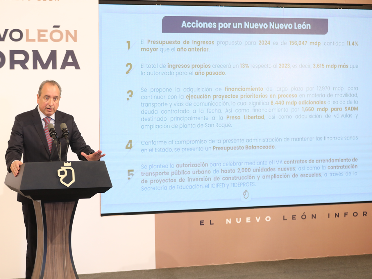 Garza Ibarra añadió que en el documento entregado al Congreso local se reitera la petición para la adquisición de financiamiento de largo plazo 12 mil 970 millones de pesos para continuar los proyectos prioritarios en materia de movilidad, transporte y vías de comunicación, lo cual significa 6 mil 440 millones de pesos adicionales al saldo de la deuda. Así como financiamiento de mil 660 millones de pesos principalmente para la Presa Libertad.