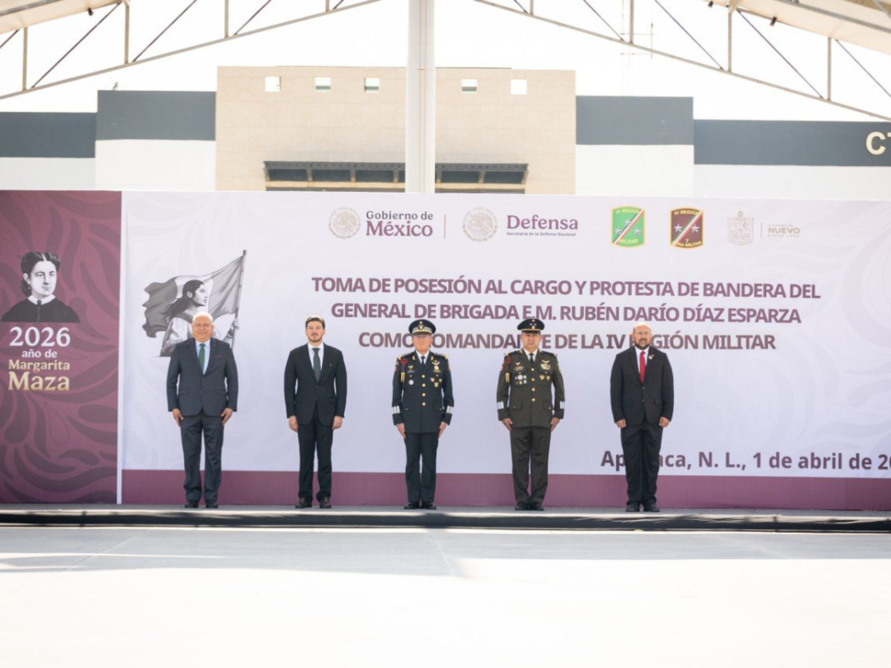 Tras asistir a la ceremonia de toma de posesión de los nuevos Comandantes de la Cuarta Región Militar, General Rubén Darío Díaz Esparza, y de la Séptima Zona Militar, General Roger David Rodríguez Arosemena, el Mandatario estatal dijo que Nuevo León es un Estado que no se detiene y exige resultados, razón por la cual se mantiene una estrecha relación de colaboración y trabajo entre la nueva Fuerza Civil y la Secretaría de la Defensa Nacional.