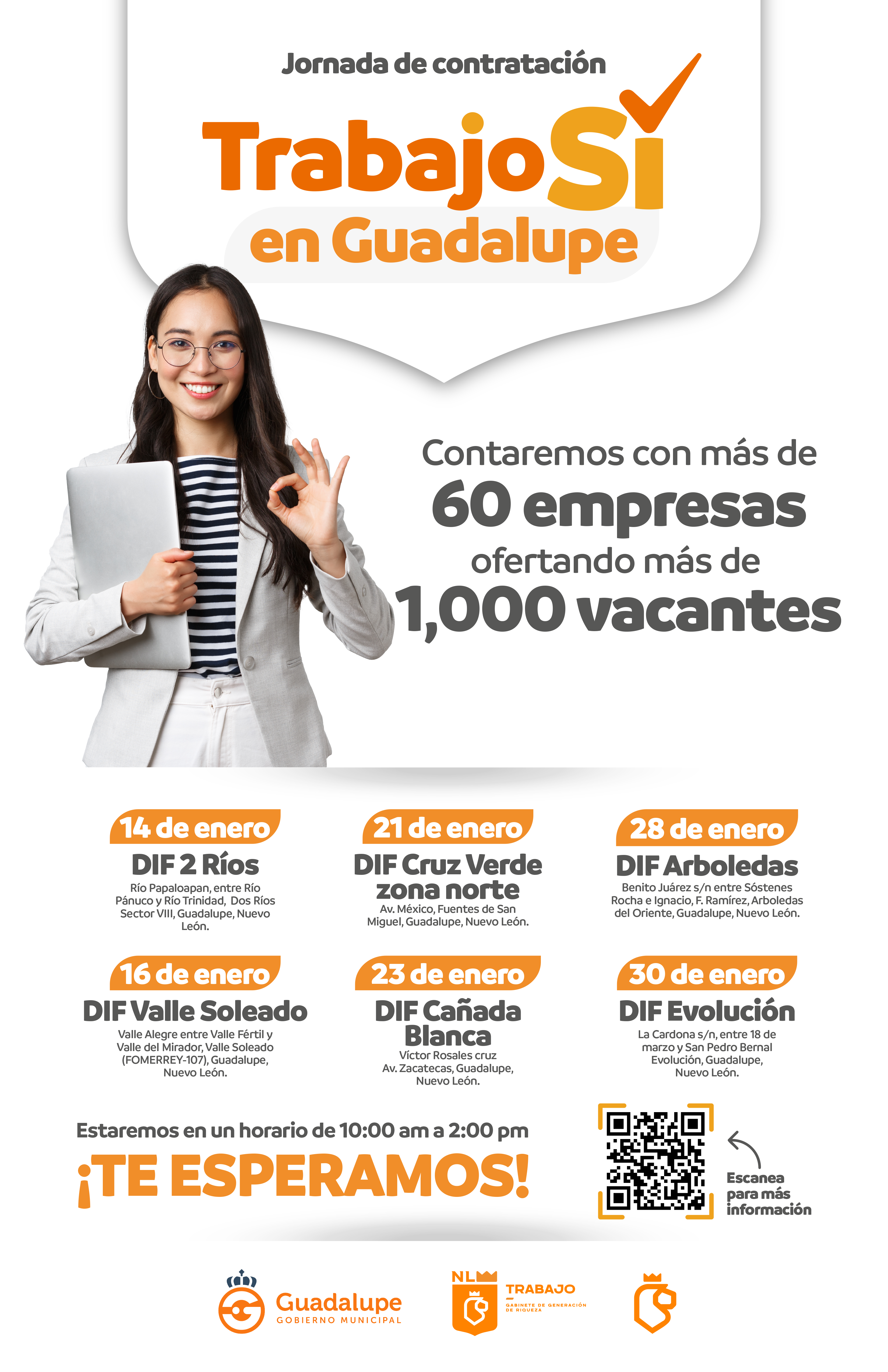 Además se realizarán 2 macro jornadas de contratación en los meses en febrero y marzo, los interesados pueden acudir a pedir más información a los DIF municipales de Guadalupe o bien a las unidades de reclutamiento ubicados en Pabellón Ciudadano 3er piso, ICET – Escobedo, ICET –Apodaca, ICET - Guadalupe e ICET - Unidad Santa Catarina, al teléfono 81-2859-8298 o al 070.