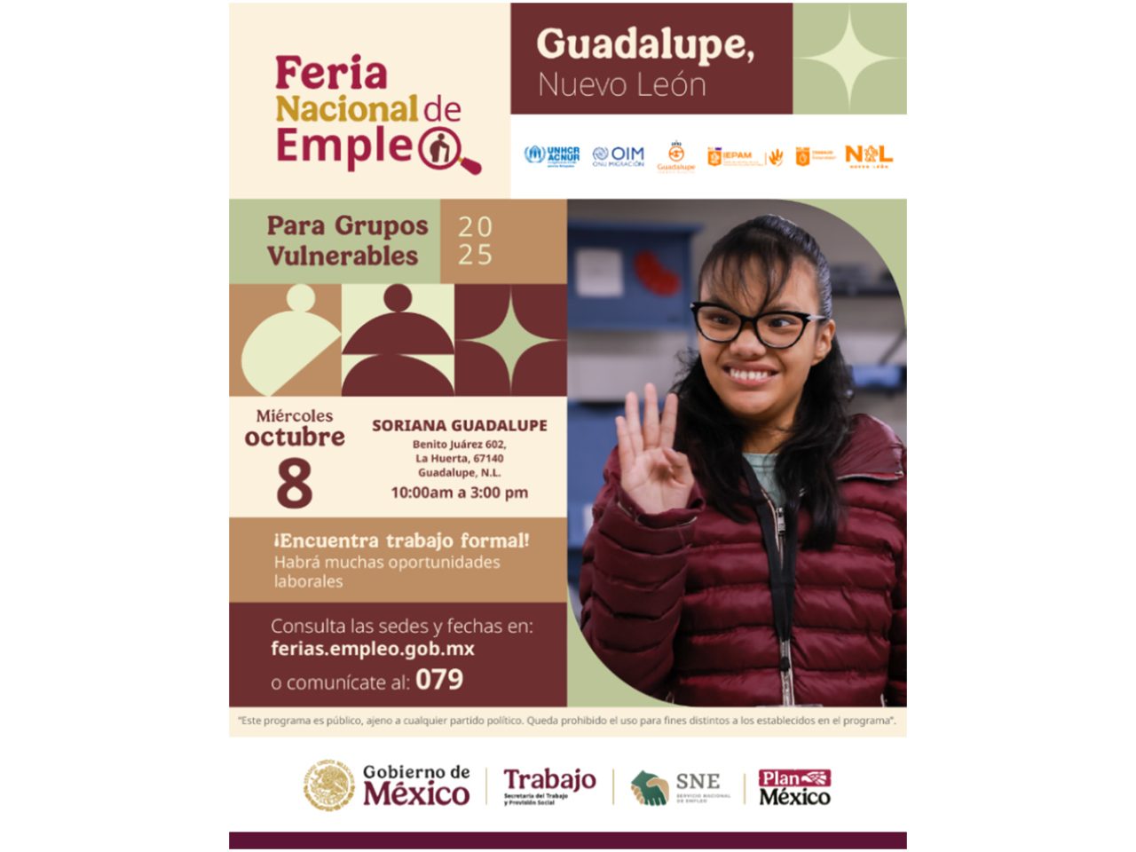 Monterrey, Nuevo León.- Con la finalidad de incrementar y acercar las oportunidades de empleo a todas las personas y crear una vinculación directa y efectiva, el Servicio Nacional del Empleo en coordinación con la Secretaría del Trabajo llevará a cabo la Feria Nacional de Empleo para Grupos Vulnerables 2025.