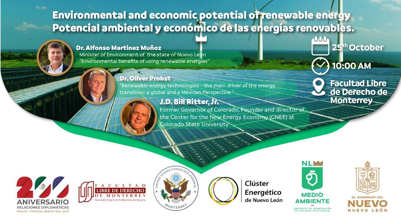 Participarán como ponentes J. D. Bill Ritter, Jr. , ex Gobernador de Colorado y fundador y director del Centro Nueva Economía Energética de la Universidad Estatal de Colorado; Oliver Probst, especialista en energías renovables del ITESM y Amado Villarreal González; director del Clúster Energético de Nuevo León como Moderador.